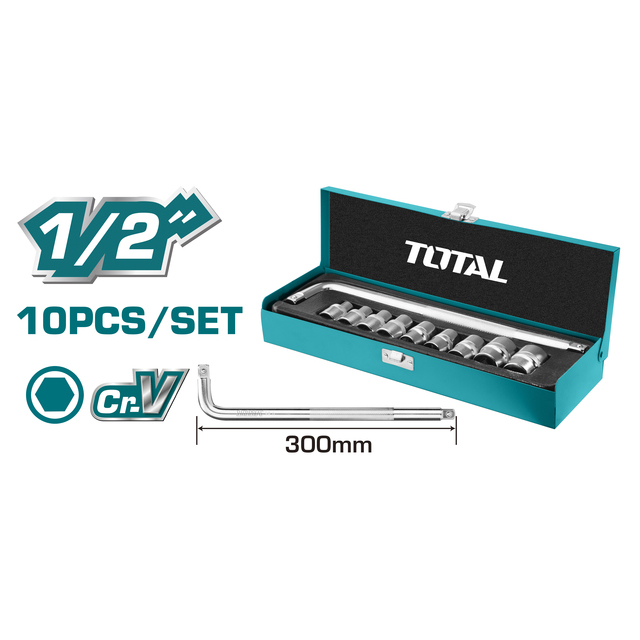 Bộ 10 đầu tuýp 1/2 inch gồm: 9 đầu tuýp 1/2 inch: 10-12-13-14-17-19-21-22-24mm. 1 tay cầm L 1/2 "300mm . Chất liệu: thép CR-V (50BV30), chịu nhiệt và mạ crôm. Đóng gói bằng hộp kim loại. 10/T