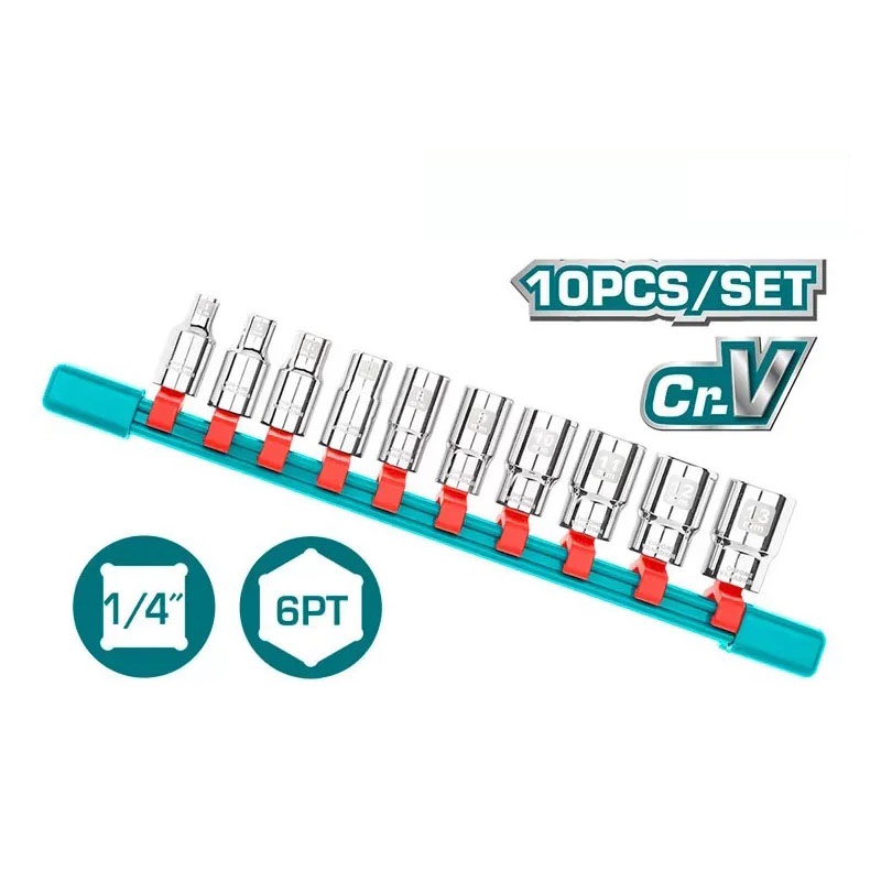 gồm: 10 đầu tuýp 1/4 inch: 5-6-7-8-9-10-11-12-13-14mm Chất liệu: 50BV30 thép CrV chất lượng cao Xử lý nhiệt, Mạ crom. Đóng gói bằng móc nhựa. 20/T