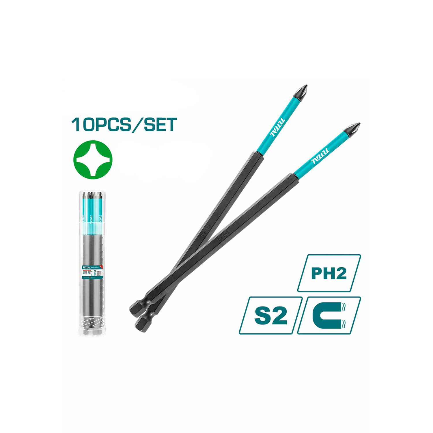 Bộ 10 mũi bắt vít PH2x250mm Có lớp vỏ giấy hiển thị Đầu mũi được tối ưu hóa lớn hơn giúp giảm hiện tượng gãy đầu. Thép công nghiệp S2, Bề mặt màu đen có nam châm, Đóng gói bằng hộp nhựa