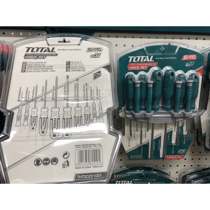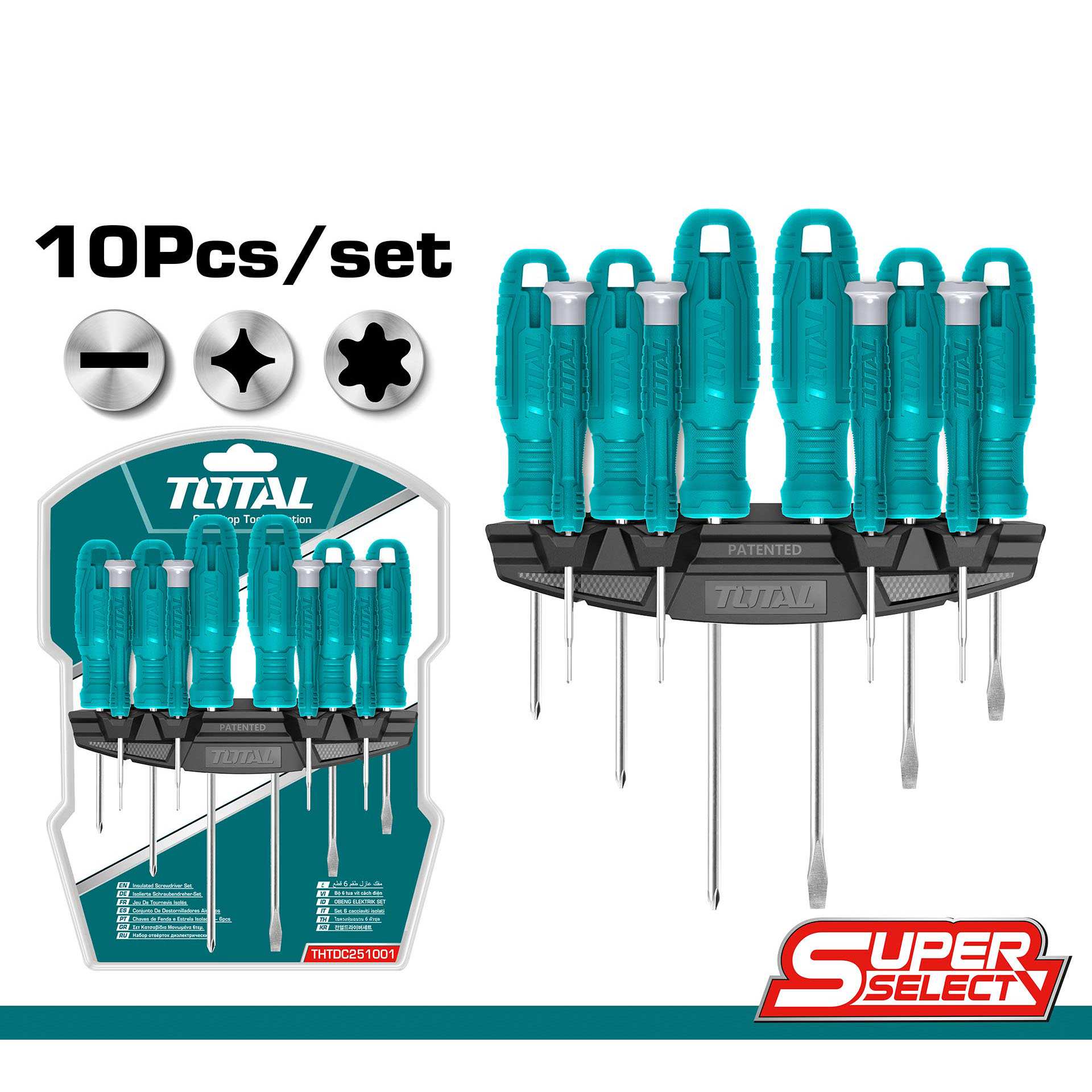 Bộ 10 tua vít dẹp, bake, sao và tua vít chuẩn. Chất liệu thép CR-V, cán tròn. Bộ 6 tua vít gồm: 1 tua vít SL5X75mm. 1 tua vít SL5X100mm 1 tua vít SL6X150mm. 1 tua vít PH1X75mm 1 tua vít PH1X100mm. 1 tua vít PH2X150mm Và 4 tua vít chuẩn gồm size: SL3 * 50 ; PH0 * 50 ; T6 * 50 ; T8 * 50. Đóng gói bằng móc nhựa và vỉ đôi. 40/T
