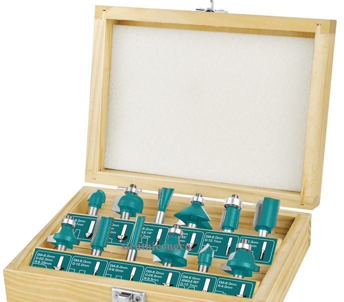 Đường kính mũi:12mm, Gồm 3 mũi thẳng 6mm, 12mm, 16mm, 1pcs 1/2" 90°V-groove bit, 1pcs 1/2" Dovetail bit 1pcs 32mm 45°Chamfer bit , 1pcs 1/2" flush trim bits; 2pcs Corner round bit:1/4",3/8", 1pcs 1/4" Core box bit; 1pcs 1/4" Core bit,1pcs R-4 Roman ogee bit - 20/T