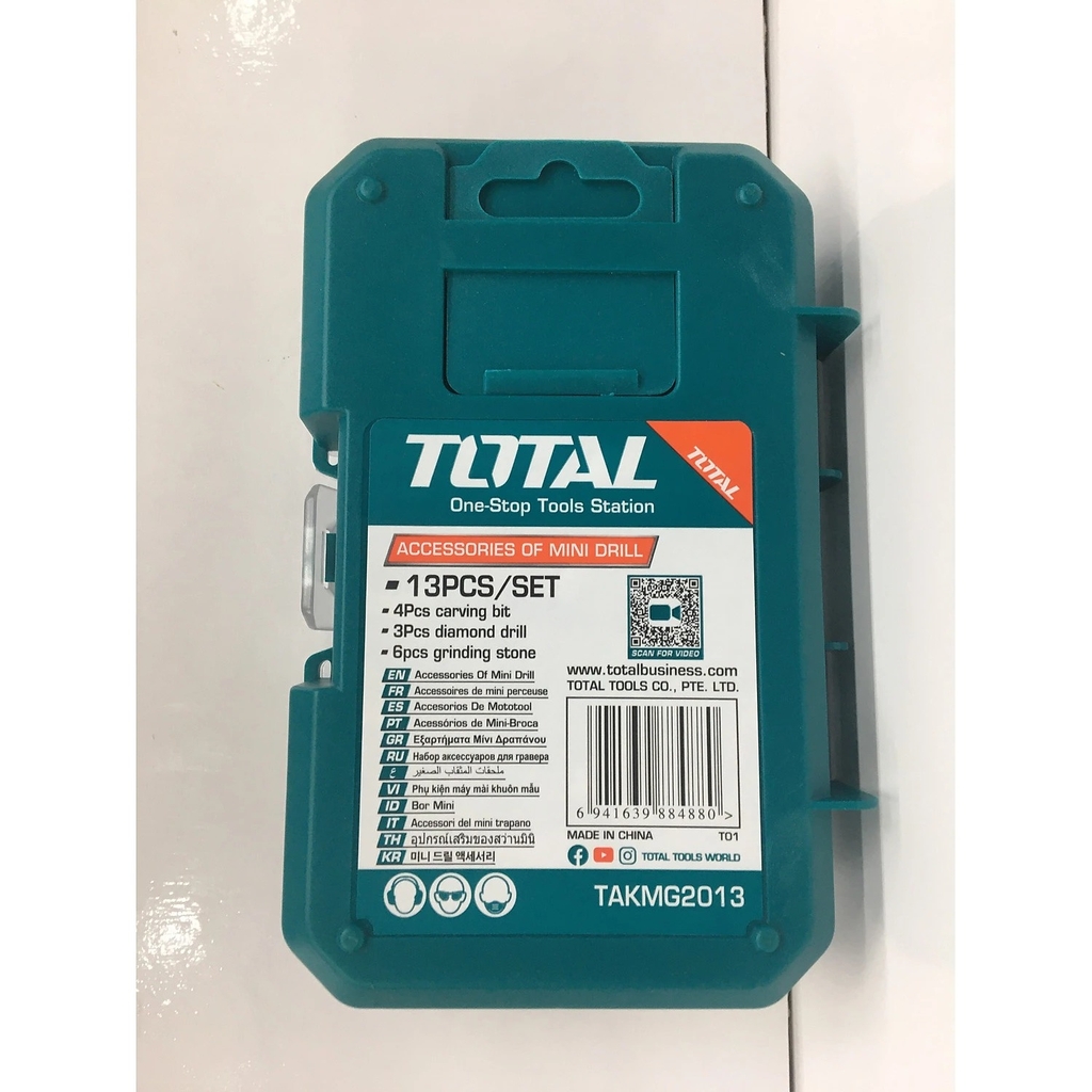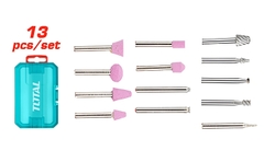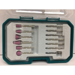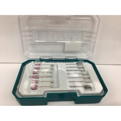 Bộ 13 linh kiện dùngcho mài đá và kính gồm: 3 mũi khoan kim cương nhân tạo, 4 mũi khắc, 6 mũi mài Đóng gói trong hộp nhựa