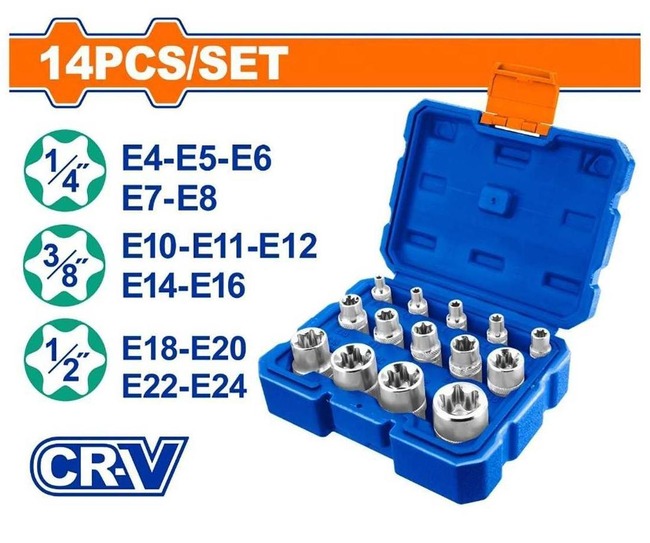 Bao gồm: Ổ cắm 5 chiếc 1/4": E4-5-6-7-8mm Ổ cắm 5 chiếc 3/8": E10-11-12-14-16mm Ổ cắm 4 chiếc 1/2" : E18-20-22-24mm