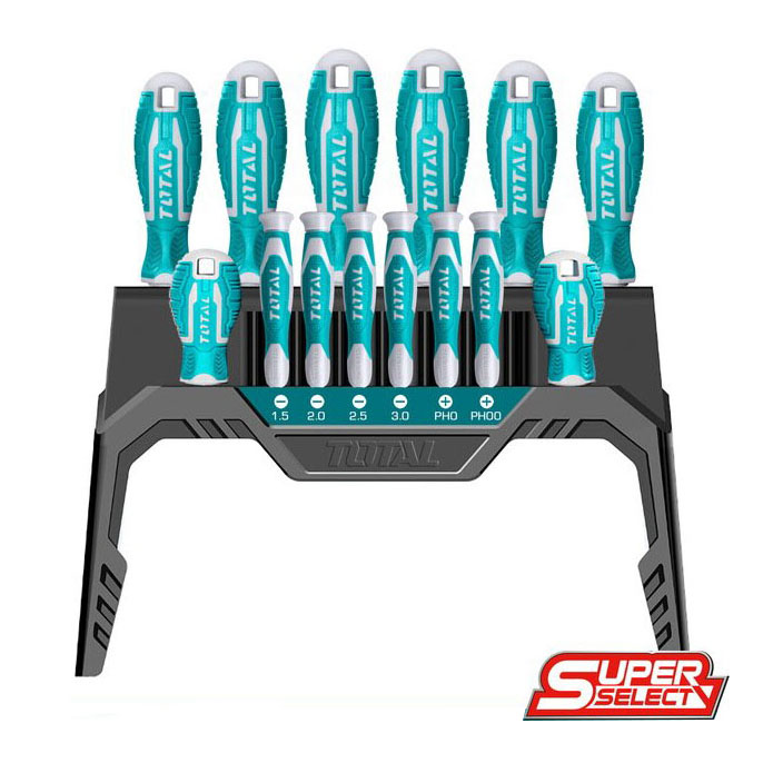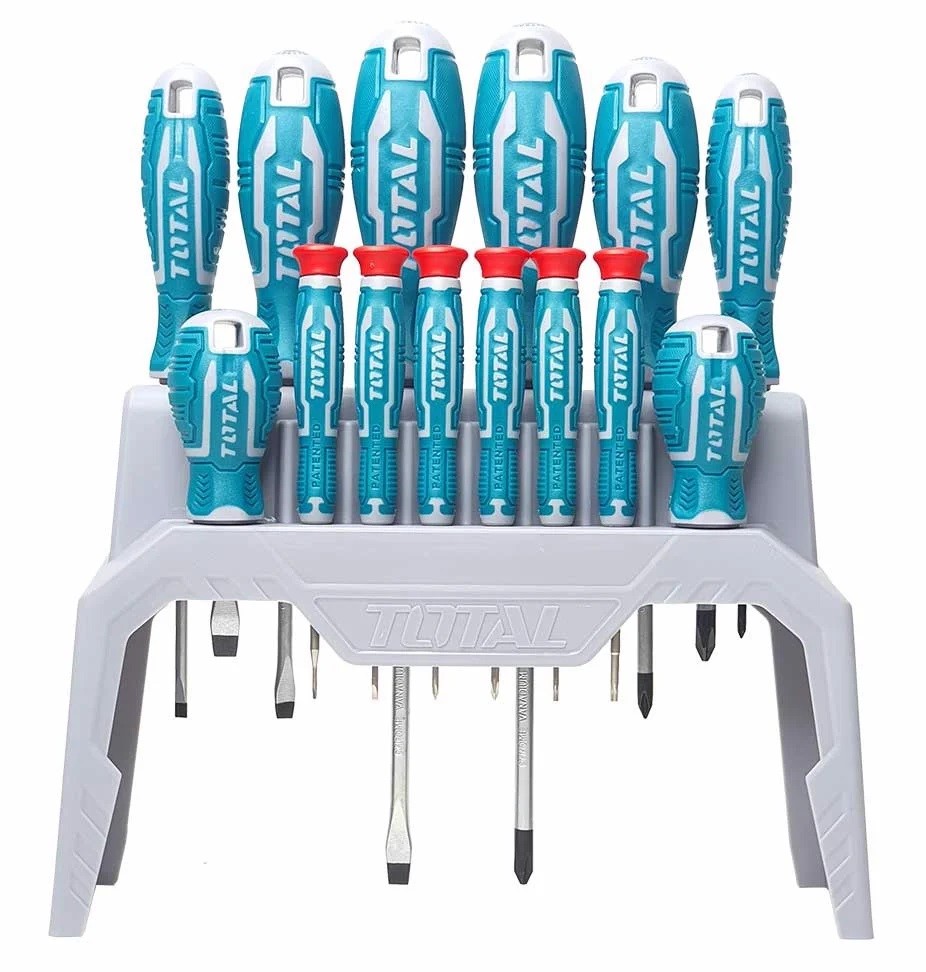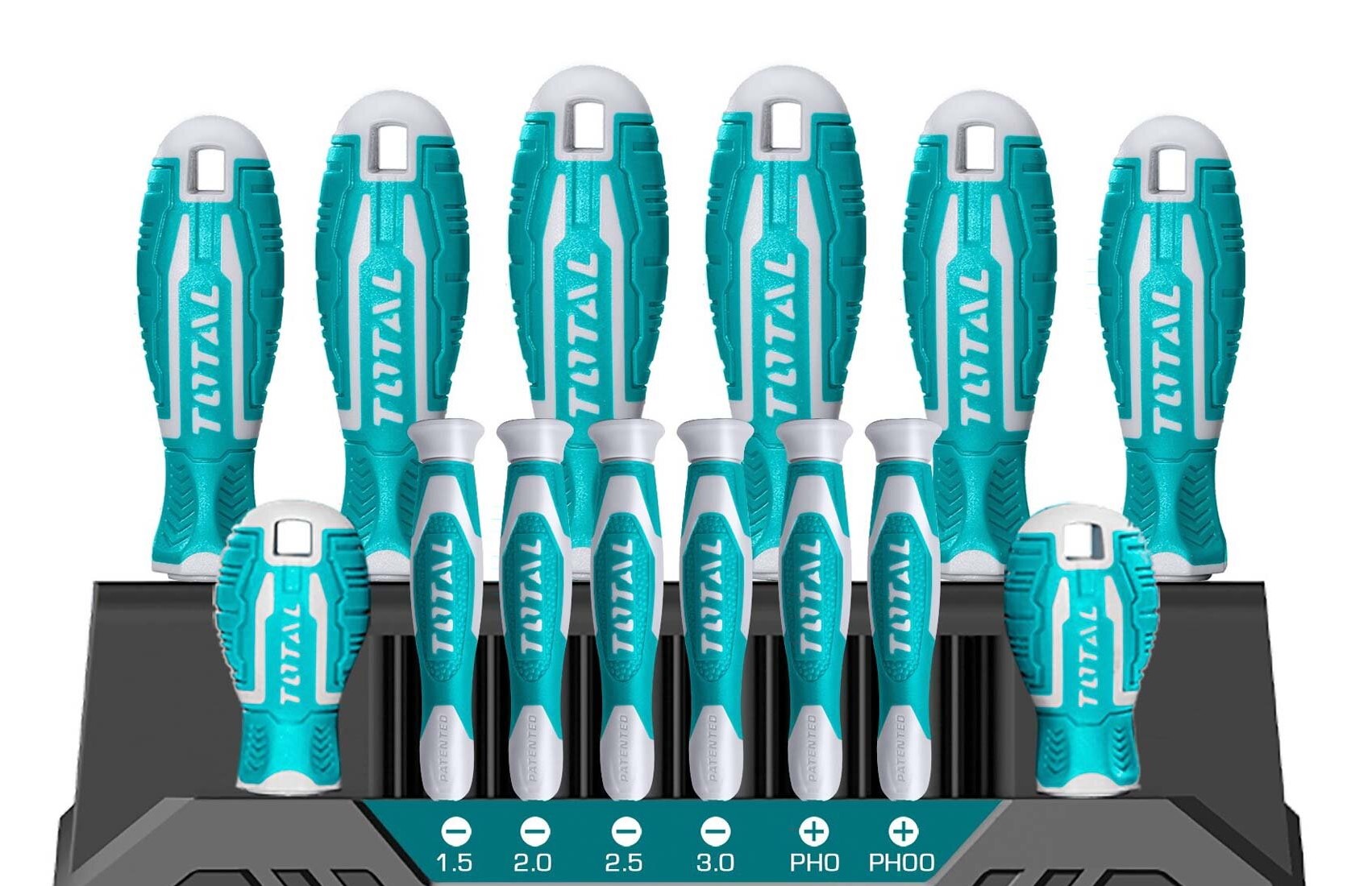 Bộ 14 tua vít chuẩn với tay cầm thiết kế mới Chất liệu: CR-V, Lưỡi tròn, 8 tua vít gồm:SL4 * 100, SL5.5 * 100, SL6.5 * 150, PH0 * 75, PH1 * 100, PH2 * 150, SL6 * 38, PH2 * 38. 6 tua vít chuẩn gồm các size: SL1.5 * 50, SL2 * 50, PH000 * 50, PH00 * 50, T6 * 50, T8 * 50 Với 1 chiếc khung nhựa. Đóng gói bằng vỉ kép. 10/T