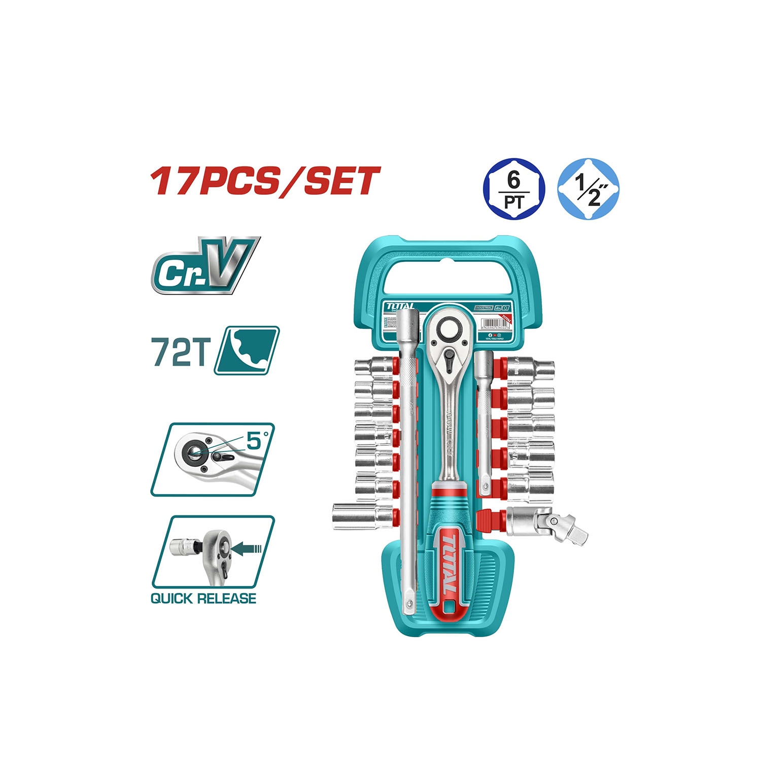 Bao gồm: 12 đầu tuýp Dr 1/2": 10-11-12-13-14-15-16-17-18-19-21-24mm 1 tay văn tháo nhanh 1/2" 72T 2 thanh nối dài 1/2" Dr: 5"(125mm) & 10"(250mm) 1 đầu tuýp mở bugi: 16mm 1 khớp nối đa năng 1/2" Dr Chất liệu: Thép Cr-V cao cấp 50BV30 Xử lý nhiệt, mạ crom. Đóng gói bằng móc nhựa