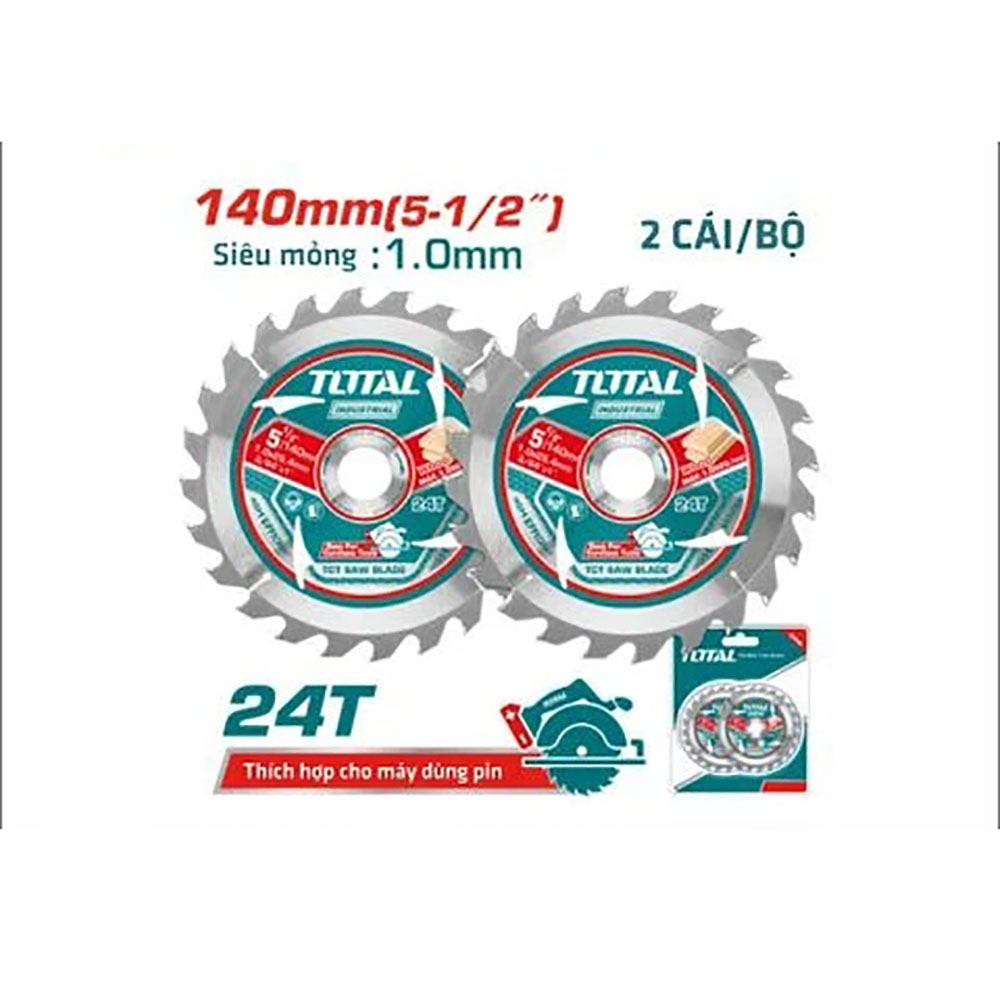 Bộ 2 lưỡi cưa TCT . Kích thước: 140mm(5-1/2") 24 răng cưa, lỗ cốt: 20mm. Vòng giảm: 16mm. Độ dày: 1.0mm Thích hợp cho máy cưa tròn dùng lithium-ion TSLI1401. Dùng cắt gỗ. Đóng gói bằng vỉ đôi