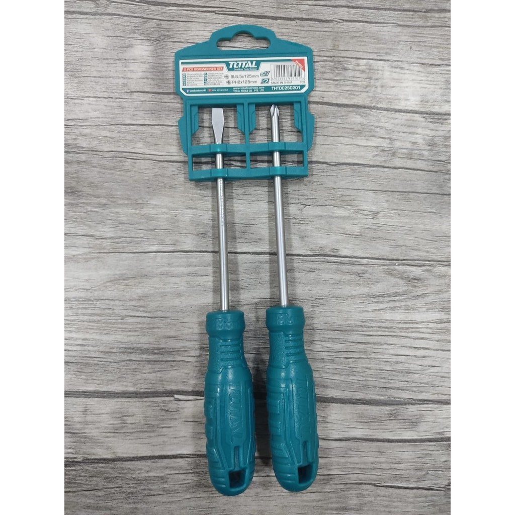 Bộ 2 tua vít - Kiểu dáng tay cầm Total mới Chất liệu thép 40Cr. Đuôi tròn Gồm 1 cái SL6X125mm và 1 cái PH2X125mm Đóng gói trong móc treo nhựa. 30/T