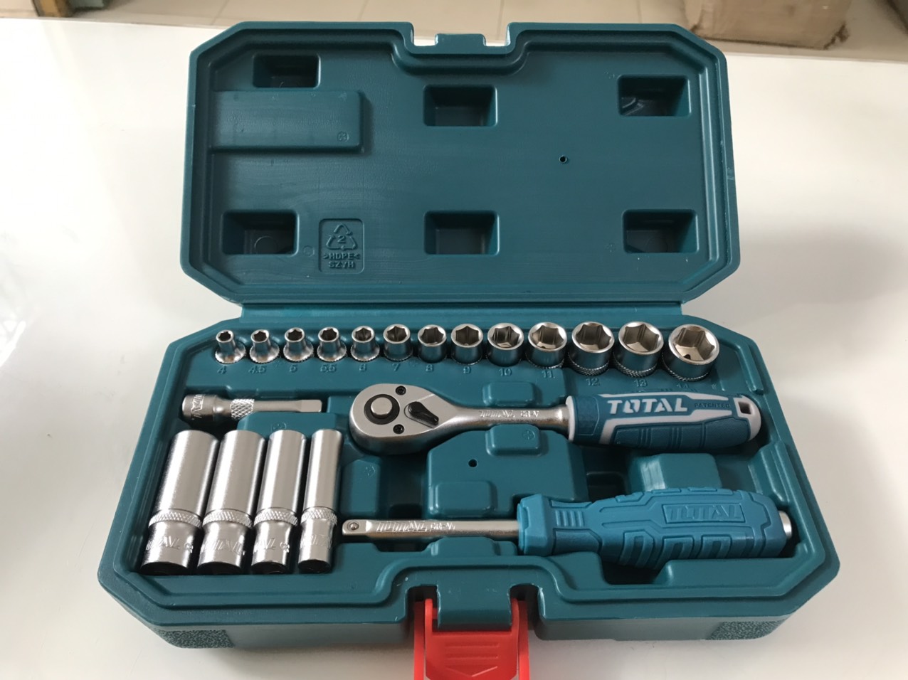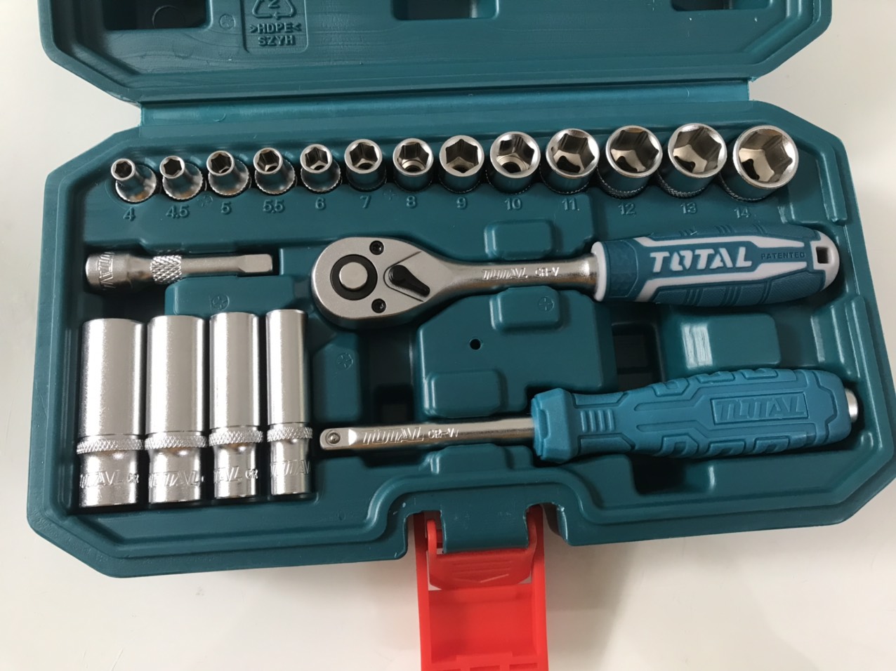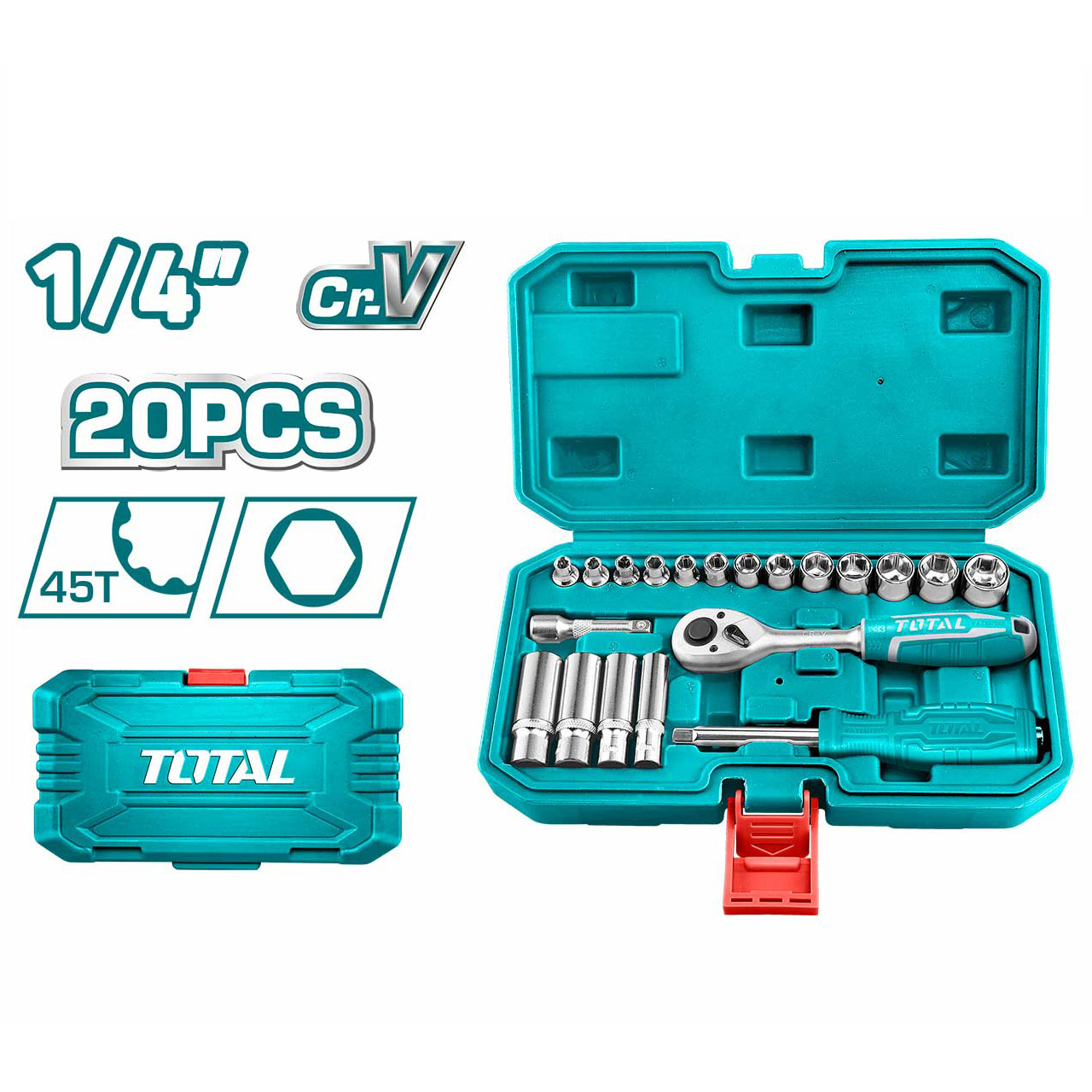 Bộ 20 đầu tuýp 1/4 inch bao gồm: 1 Tay vặn DR. 1/4 inch, 45T. 13 đầu tuýp DR.1/4 inch size: 4,4.5,5,5,5,6,7,8,9,10,11,12,13,14mm. 1 Thanh mở rộng DR 1/4 inch. 2" (50mm). 1 Tay cầm tua vít DR. 1/4 inch 4 đầu tuýp lục giác sâu 1/4 inch: 8,10,12,13mm Chất liệu : CR-V (50BV30), được xử lý nhiệt Đóng gói trong hộp nhựa BMC. 12/T
