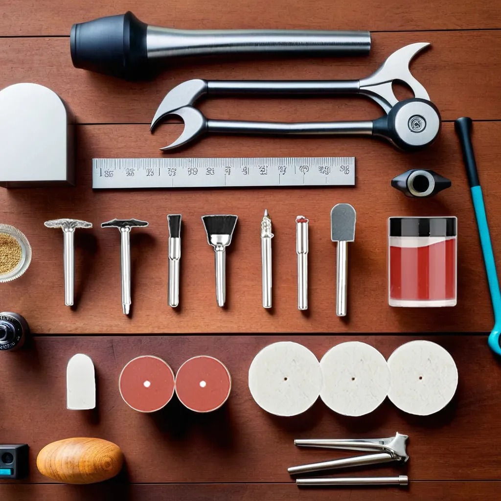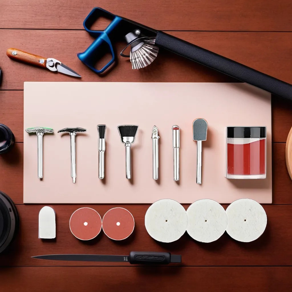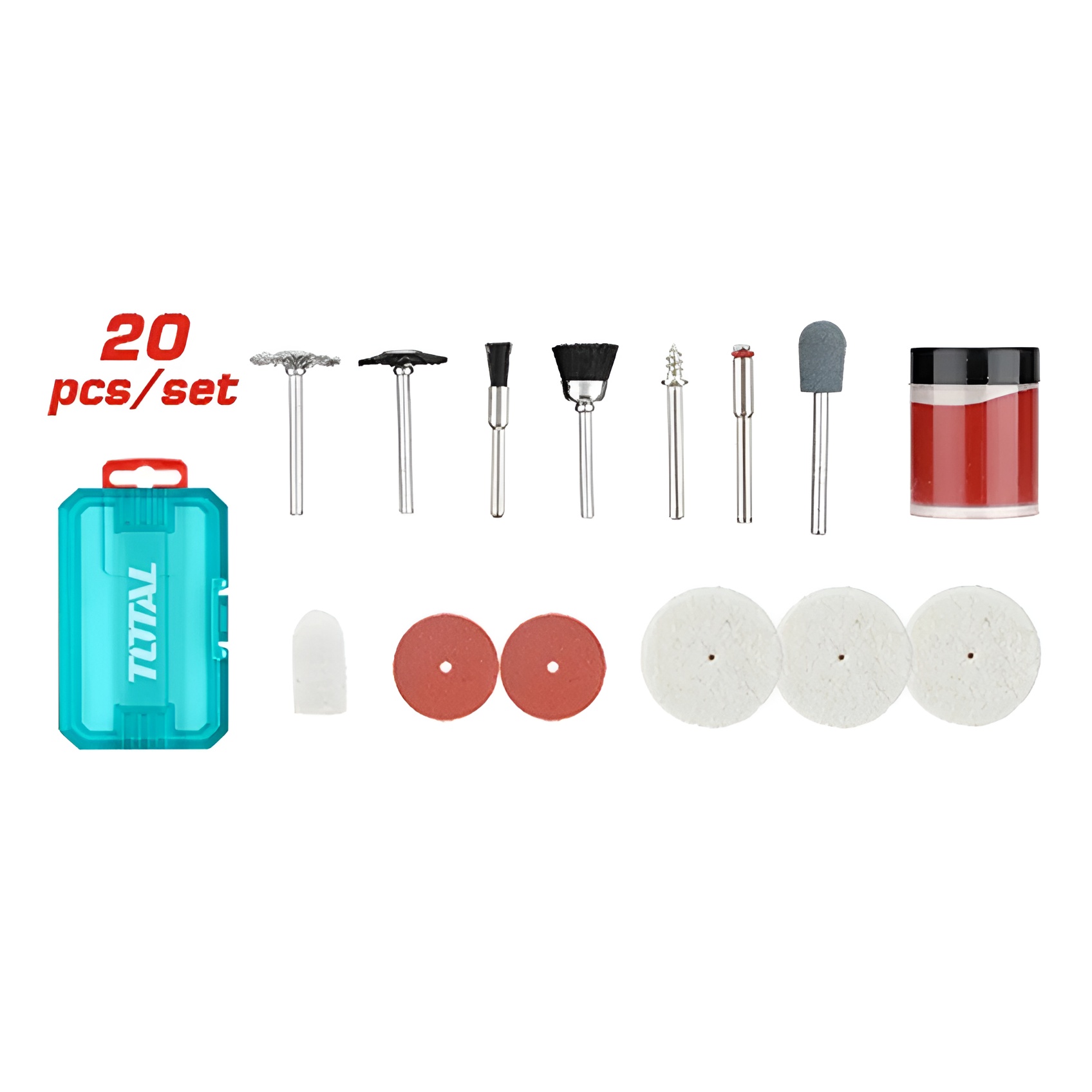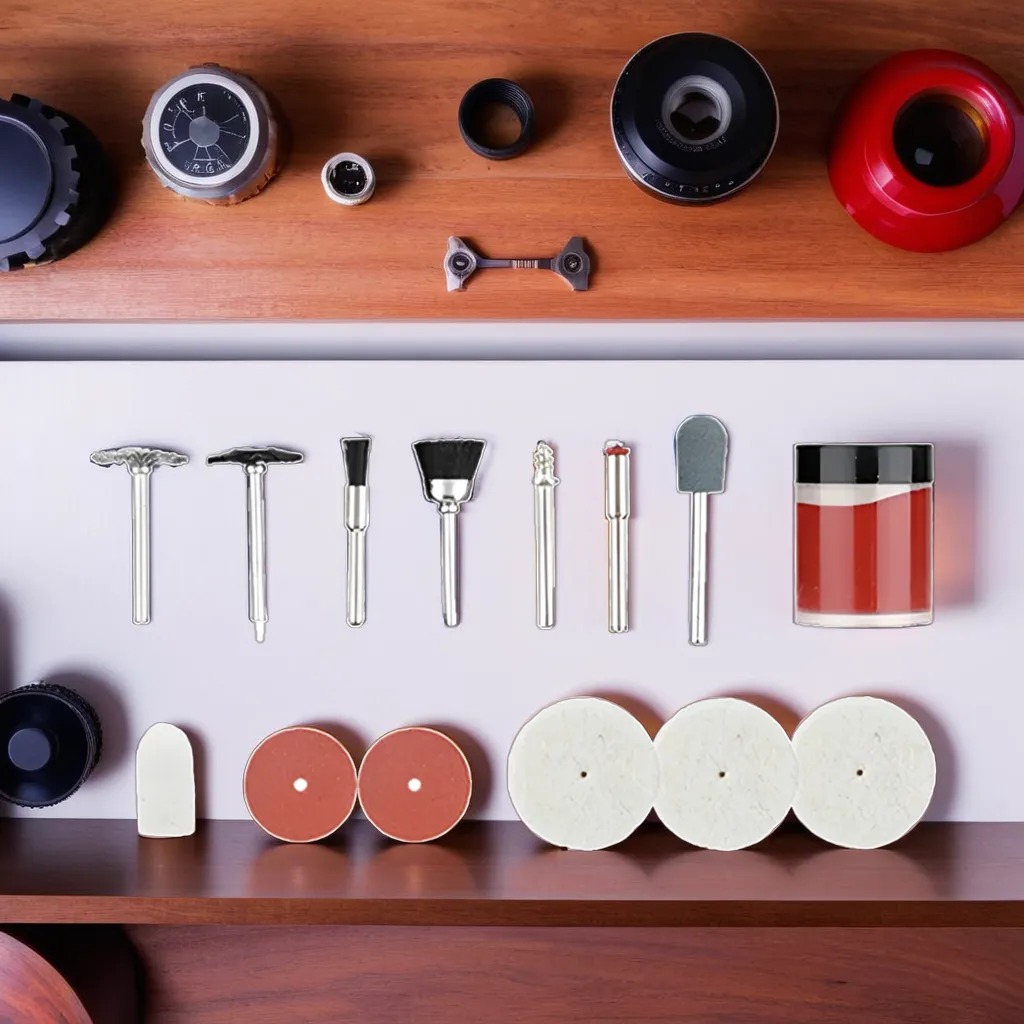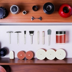 Bộ 20 linh kiện làm sạch & đánh bóng gồm: 2 trục mài, 3 bàn chải nylon, 1 bàn chải dây. 9 đĩa đánh bóng, 1 đĩa thấm, 1 đĩa len tơ, 1 mũi mài và 1 đĩa mài bóng Đóng gói trong hộp nhựa
