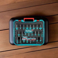 Bộ 24 mũi phay đuôi 12mm gồm: 1 mũi phay 12.7mm ; 1 mũi kết hợp 12,7mm 1 mũi bồ câu 9,5mm ; 1 mũi bồ câu 12,7mm 1 mũi rãnh 12,7mm 90° ; 1 mũi tròn 9,5mm. 1 mũi tròn 12,7mm; 1 mũi 9,5mm 1 mũi 6,35mm ; 1 mũi thẳng 6.35mm. 1 mũi thẳng 9,5mm; 1 mũi thẳng 12,7mm 1 mũi thẳng 19.0mm ; 1 mũi 12,7mm 1 mũi 3.2mm; 1 mũi tròn 4,76mm. 1 mũi tròn 6.35mm ; 1 mũi tròn 9.5mm 1 mũi 6,35mm ; 1 mũi 9,5mm 1 mũi 4.0mm ; 1 mũi nghiêng 45° 30.0mm 1 mũi 6,35mm; 1 mũi 12,7mm