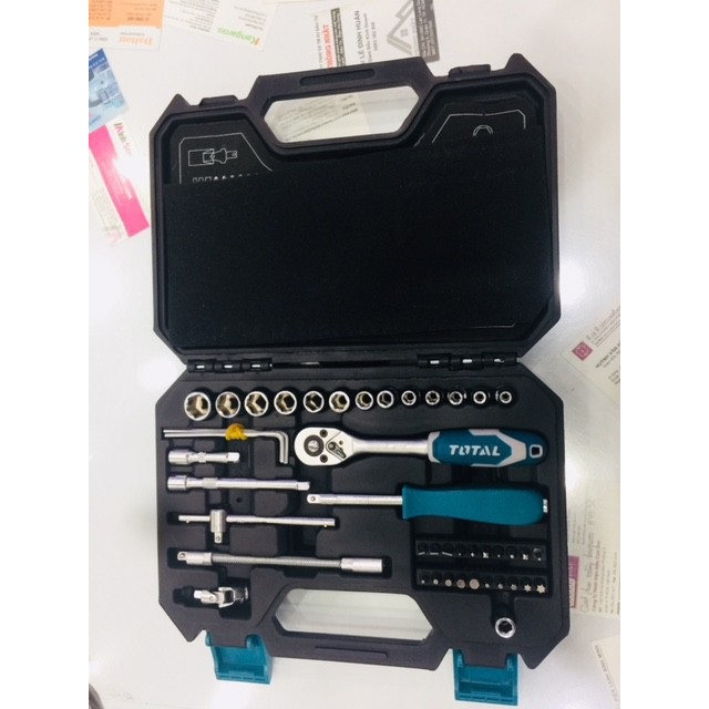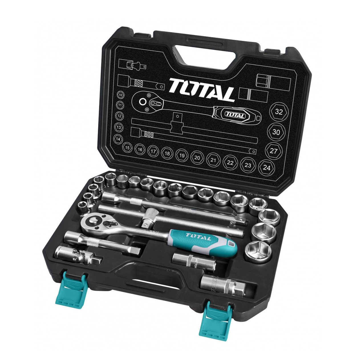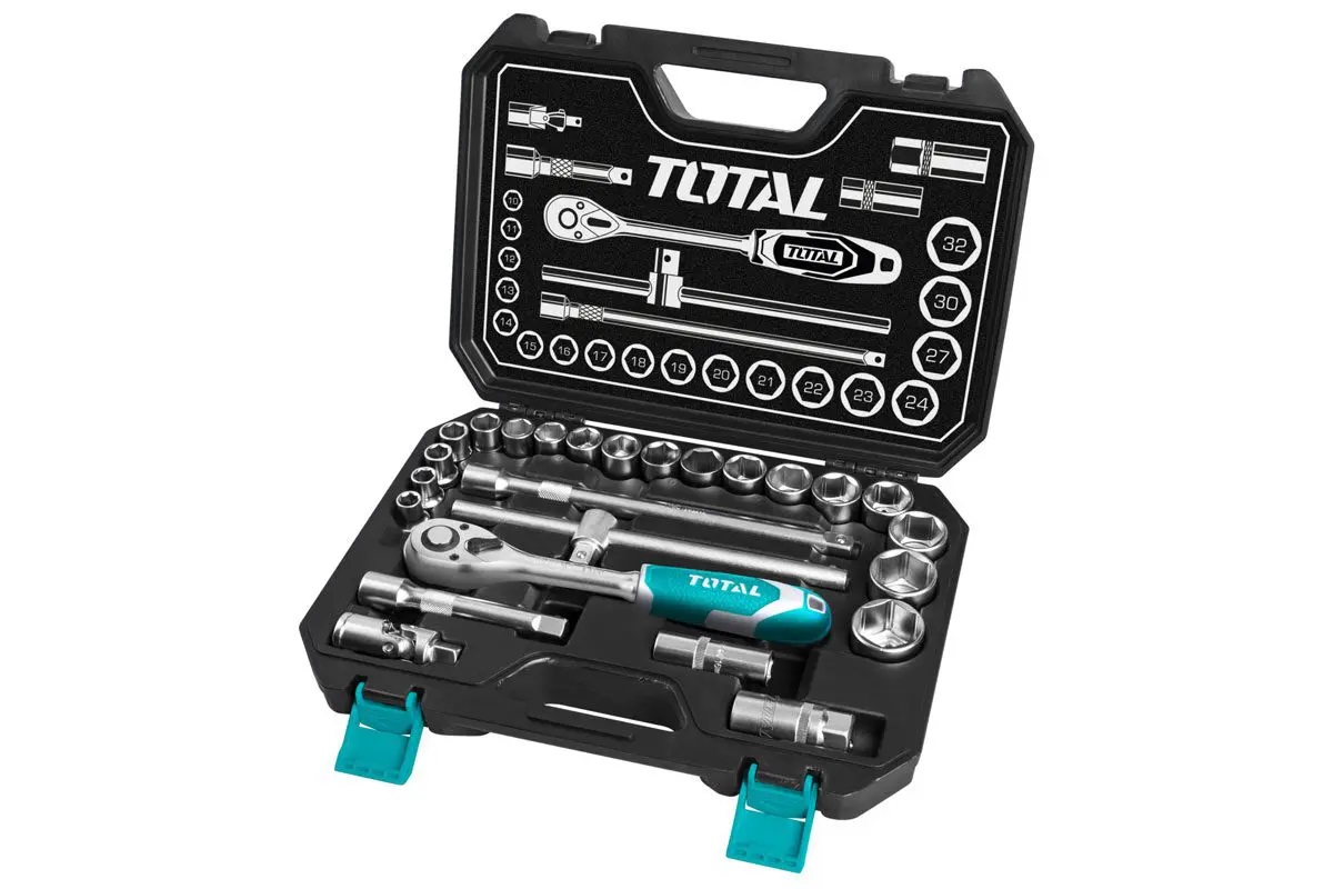 Bộ 25 cái đầu cắm gồm: 1 đầu ratchet vặn 1/2" DR.,45T. 18 đầu cắm 1/2" size: 10-11-12-13-14-15-16-17-18-19-20-21-22-23-24-27-30-32mm; 1 khớp nối 1/2" DR.; 2 thanh mở 1/2" DR. size 125mm & 250mm; 2 đầu cắm spark plug: 16mm & 21mm; 1 thanh trượt chữ T 1/2" *250mm. Chất liệu: CV (50BV30), chịu nhiệt. Đóng gói theo quy cách Total BMC+ hộp màu - 4/T