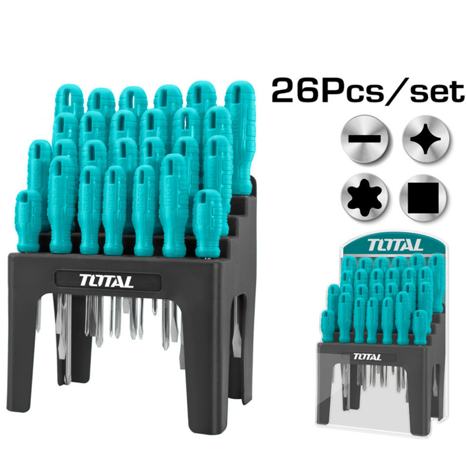 Bộ 26 tua vít cán tròn bao gồm : 7 Tua vít dẹp size : SL6 * 38 ; SL3 * 75 ; SL5.5 * 100 ; SL5.5 * 100 ; SL6.5 * 125 ; SL6.5 * 150 ; SL8 * 200 ; 11 tua vit bake : PH2 * 38 ; PH00 * 75 ; PH0 * 75 ; PH1 * 75 ; PH1 * 100 ; PH1 * 100 ; PH2 * 100 ; PH2 * 125 ; PH2 * 150 ; PH3 * 150 ; PH3 * 200 ; 6 tua vít sao : T15 * 100 ; T20 * 100 ; T25 * 100 ; T27 * 125 ; T30 * 125 ; T40 * 125. 1 tua vít vuông P S1 * 100 ; S2 * 100 và 1 chiếc khung nhựa. 4/T