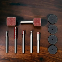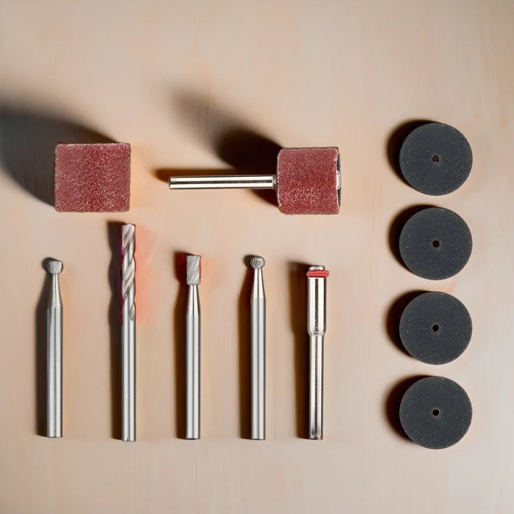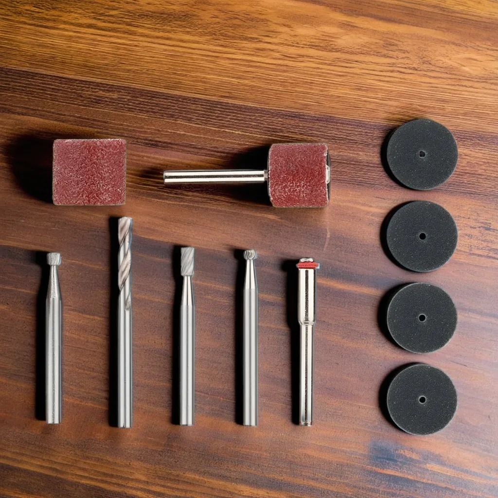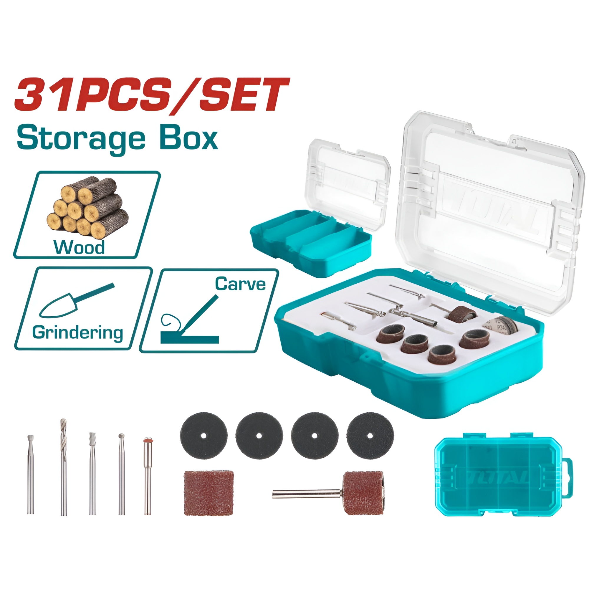 Bộ 31 bộ dùng cho mài gỗ gồn: 3 mũi khắc, 5 miếng chà nhám, 20 đĩa chà nhám, 1 mũi khoan, 1 trục và 1 trống chà nhám có trục Đóng gói bằng hộp nhựa
