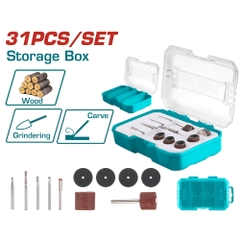 | Bộ 31 bộ dùng cho mài gỗ gồm | 3 mũi khắc, 5 miếng chà nhám, 20 đĩa chà nhám, 1 mũi khoan, 1 trục và 1 trống chà nhám có trục |