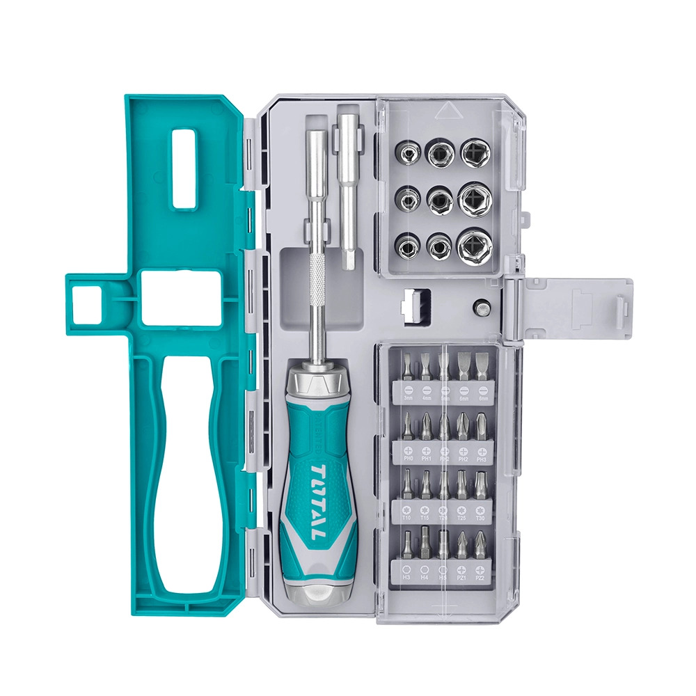Gồm 20 cái tua vít 6.35 x 25mm với các size tương ứng: PH0,PH1,PH2,PH2,PH3,SL3,SL4,SL5,SL6,SL6,HEX3,HEX4,HEX5,PZ1,PZ2,T10,T15,T20,T25,T30 1 khớp nối: 4-6mm (25mm),9 cái đầu cắm điều hợp 1/4 inch x 20.5 với size: 4MM 5MM 6MM 7MM 8MM 9MM 10MM 11MM 12MM - 1cái đầu giữ nam châm 125mm, 1 cái đầu giữ nam châm 75mm, 1 cái tay cầm ratchet công nghiệp 7 trong 1 của thương hiệu Total - 24/T