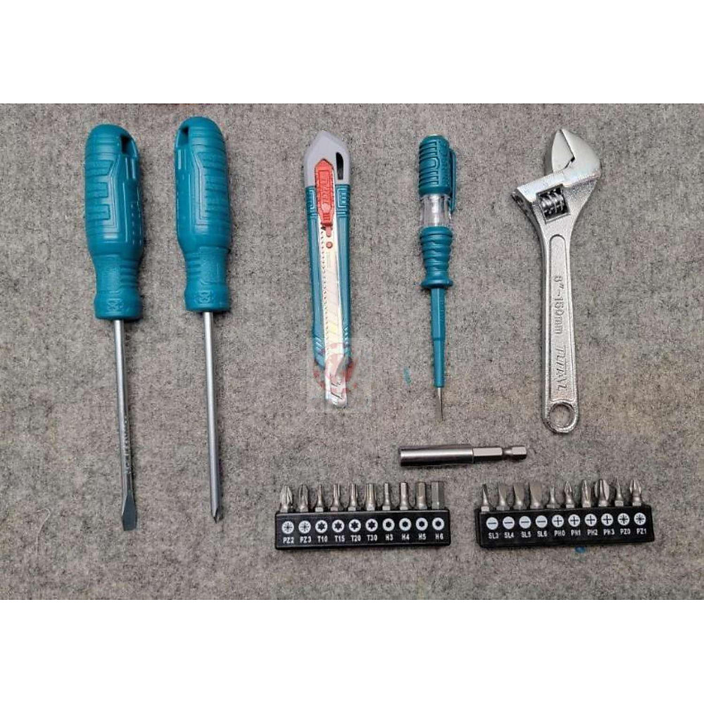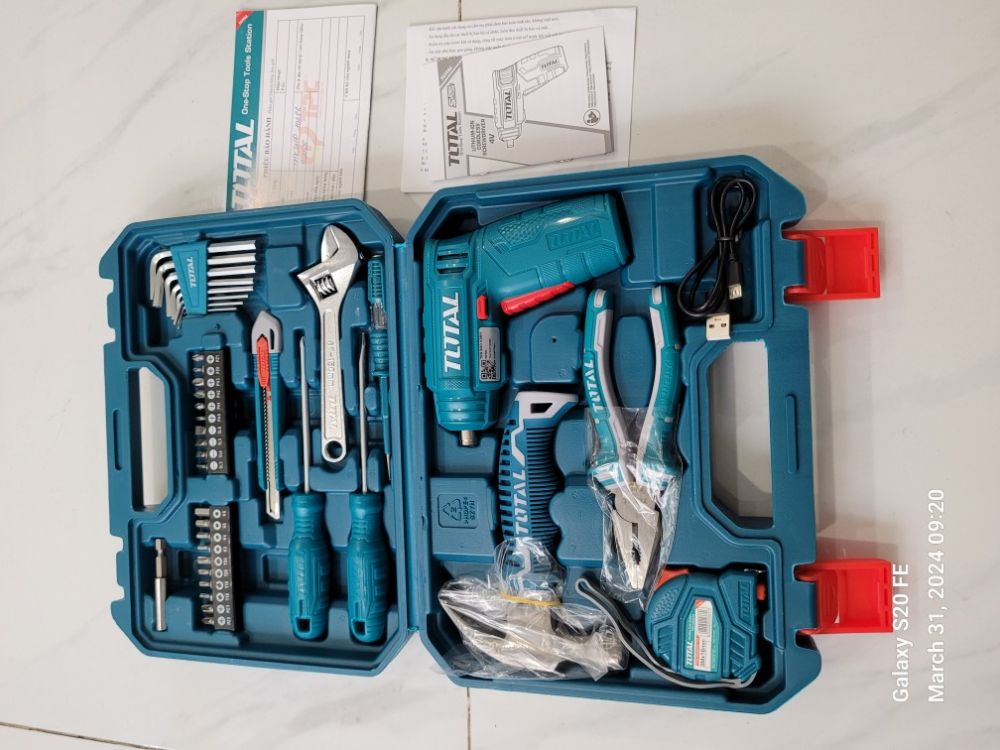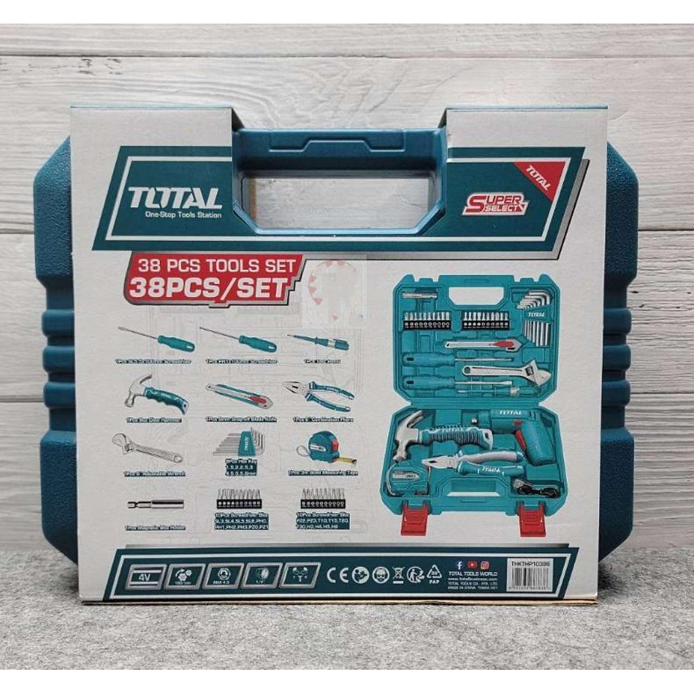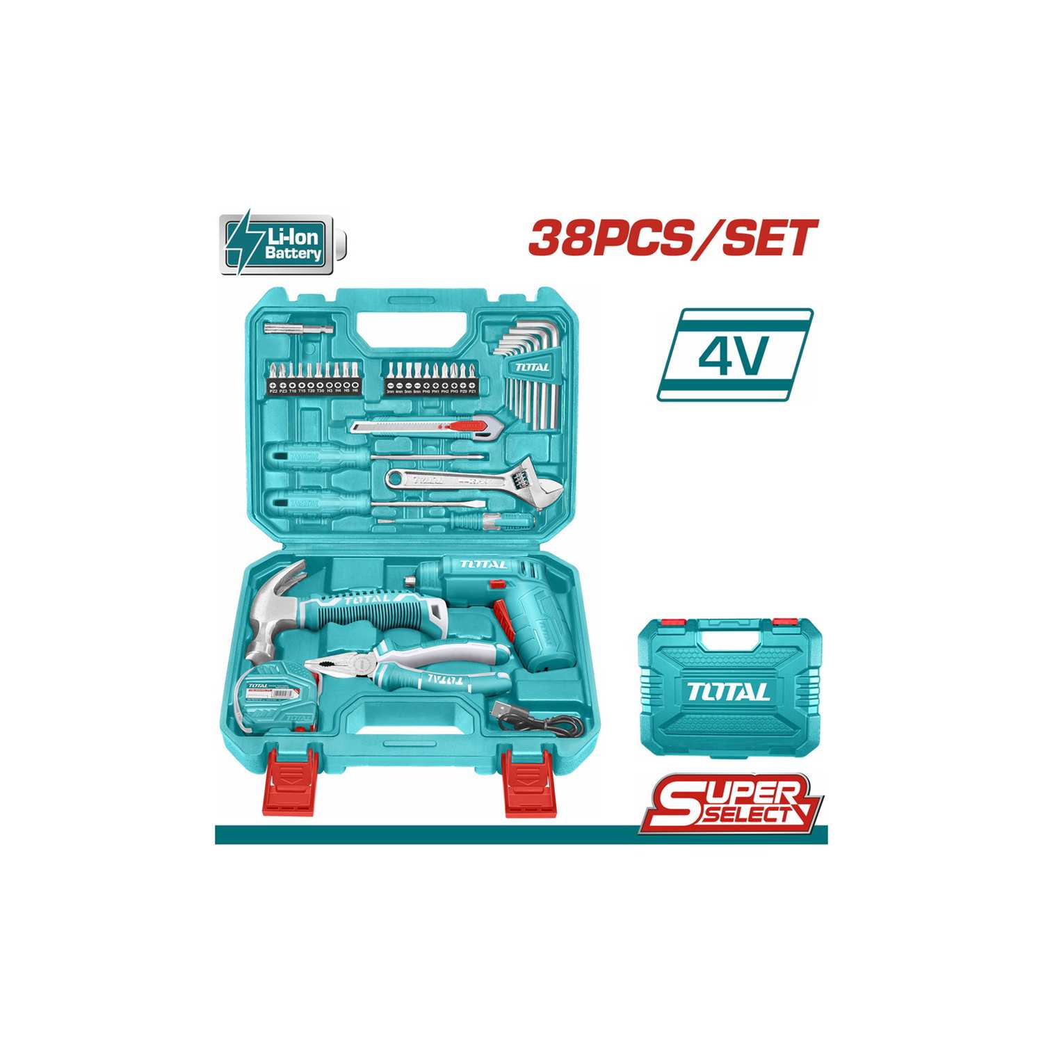Bộ 38 dụng cụ gia đình bao gồm: 1 máy siết vít dùng pin 4V (TSDLI0404) Kèm 1 dây sạc USB, Điện áp: 4V; Đầu lục giác: 1/4"; Tốc độ không tải: 180rpm, Mô-men xoắn tối đa: 4N.m; 1 giá đỡ tua vít có nam châm; 1 tua vít dẹp sl5.5x100; 1 tua vít bake PH1x100; 1 kềm răng 6 inch; 1 mỏ lết 6 inch;; 1 búa nhổ đinh 8Oz; 1 bút thử điện (Điện áp thử : 100-500VAC); 1 hước kéo 3m; 1 rao rọc giấy 9mm; 20 mũi vít SL3,SL4,SL5,SL6,PH0,PH1,PH2,PH3, PZ0, PZ1,PZ2,PZ3,T10,T15,T20,T30,H3,H4,H5,H6 8 chìa lục giác: 1.5/2/2.5/3/4/5/5.5/6mm