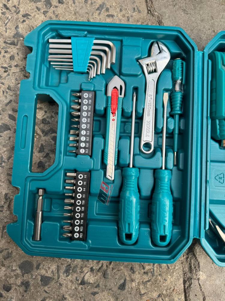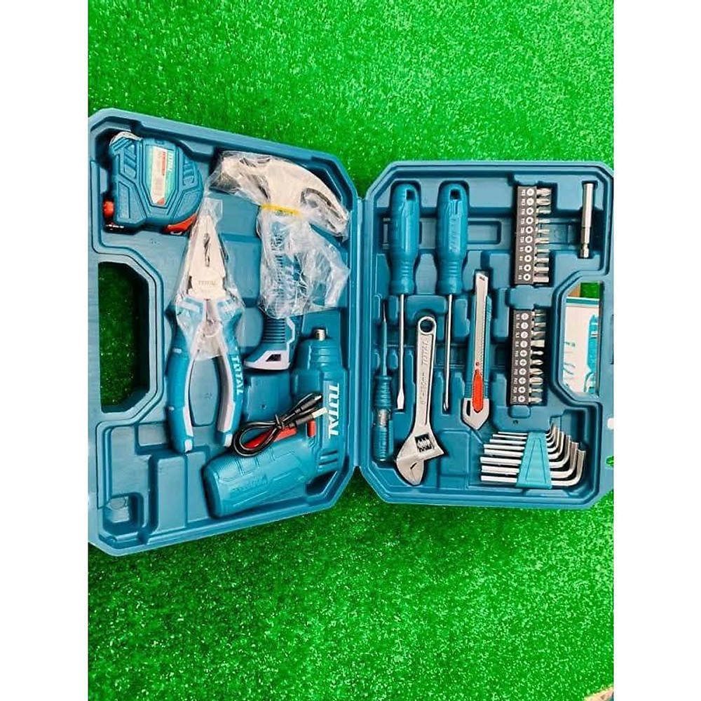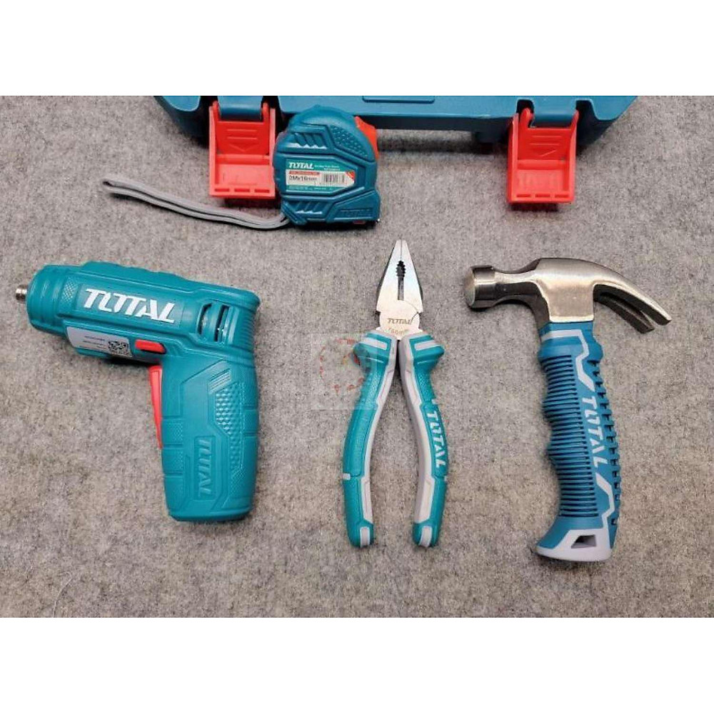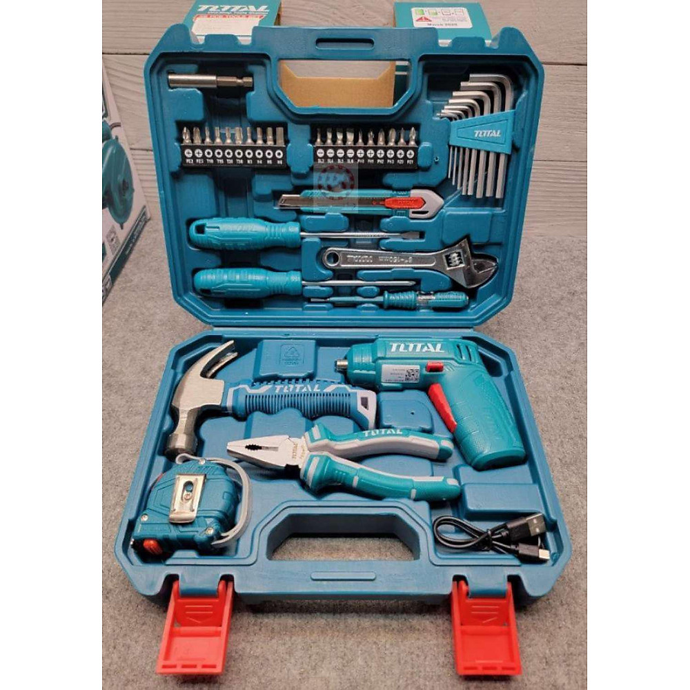 Bộ 38 dụng cụ gia đình bao gồm: 1 máy siết vít dùng pin 4V (TSDLI0404) Kèm 1 dây sạc USB, Điện áp: 4V; Đầu lục giác: 1/4"; Tốc độ không tải: 180rpm, Mô-men xoắn tối đa: 4N.m; 1 giá đỡ tua vít có nam châm; 1 tua vít dẹp sl5.5x100; 1 tua vít bake PH1x100; 1 kềm răng 6 inch; 1 mỏ lết 6 inch;; 1 búa nhổ đinh 8Oz; 1 bút thử điện (Điện áp thử : 100-500VAC); 1 hước kéo 3m; 1 rao rọc giấy 9mm; 20 mũi vít SL3,SL4,SL5,SL6,PH0,PH1,PH2,PH3, PZ0, PZ1,PZ2,PZ3,T10,T15,T20,T30,H3,H4,H5,H6 8 chìa lục giác: 1.5/2/2.5/3/4/5/5.5/6mm