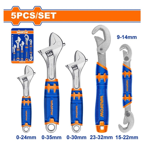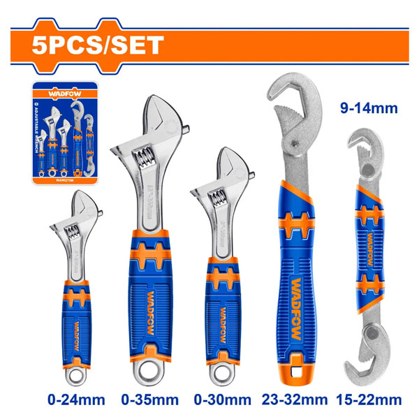 - Bộ 5 mỏ lết gồm: 1 mỏ lết 150mm(6"), kích thước kẹp: 0-24mm 1 mỏ lết 200mm(8") , kích thước kẹp: 0- 30mm 1 mỏ lết 250mm(10"), kích thước kẹp: 0- 35mm 1 cờ lê hai đầu miệng, chiều rộng đầu nhỏ: 9- 14mm & chiều rộng đầu lớn: 15-22mm. 1 cờ lê một đầu miệng, chiều rộng: 23-32mm