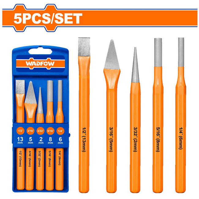 - Chất liệu: Thép 40Cr Đường kính tay cầm: 10mm(3/8"). Gồm: 1 đục nguội: 13x152mm(1/2"x6"),1 đục mũi nhọn: 5x152mm(3/16"x6") 1 đục côn: 2x140mm(3/32"x5-1/2"), 2 đục lỗ : 6x152mm(1/4"x6"). xử lý nhiệt phân bổ đều.