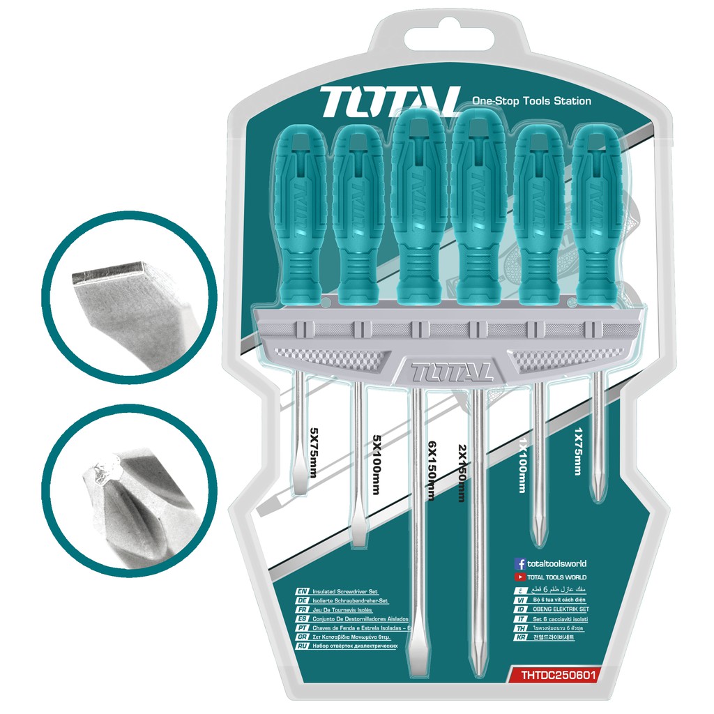 Bộ 6 tua vít - Kiểu dáng tay cầm Total mới. Chất liệu thép 40Cr. Đuôi tròn . Gồm 1 cái SL5X75mm-1 cái SL5X100mm 1 cái SL6X150mm - 1 cái PH1X75mm - 1 cái PH1X100mm 1 cái PH2X150mm. Đóng gói trong móc treo nhựa. 20/T