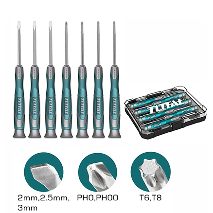 Bộ 7 cái vít chuẩn gồm: SL2.0*50,SL2.5*50SL3.0*50, PH00*50,PH0*50,T6*50,T8*50. Chất liệu CR-V. Tay cầm tiện dụng, thoải mái - 120/T