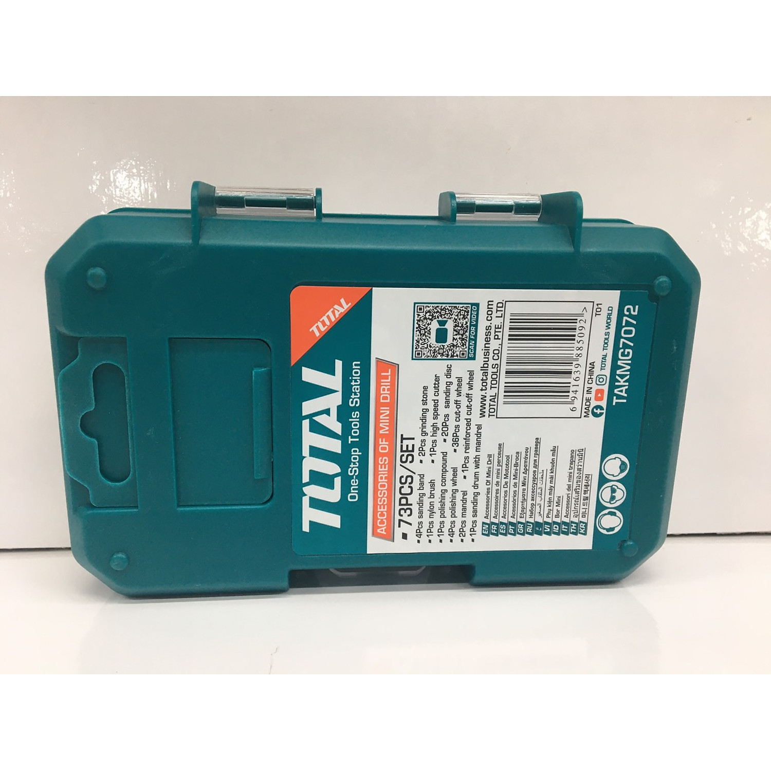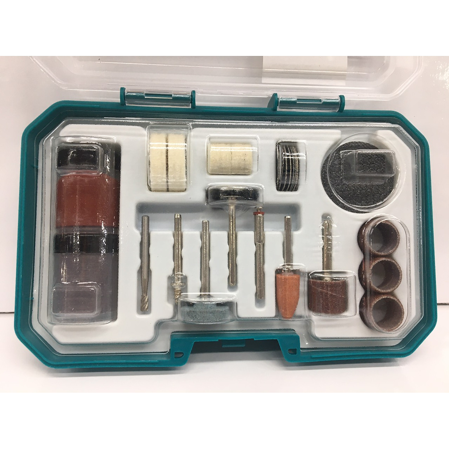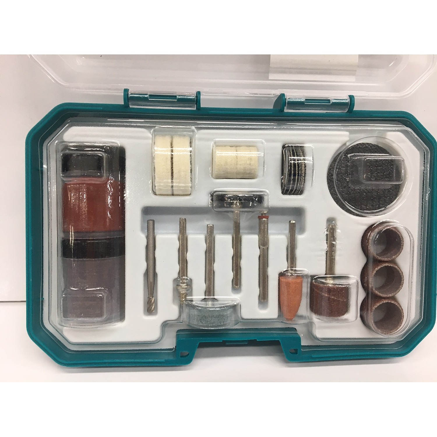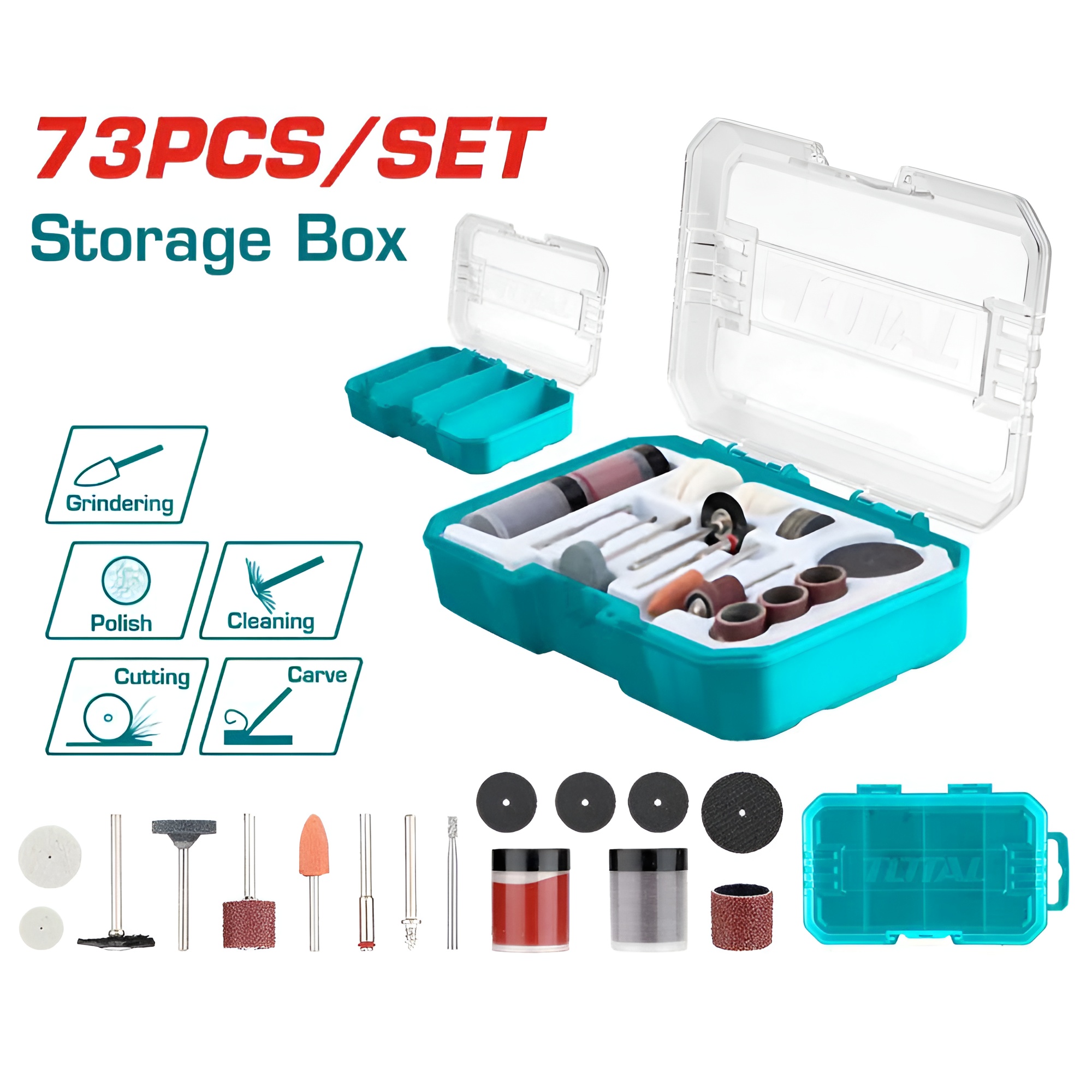 Bộ 73 linh kiện đa năng gồm: 4 miếng mài, 2 mũi mài, 1 bàn chải nylon, 2 trục, 1 lưỡi cắt tốc độ cao, 1 đĩa mài bóng, 1 đĩa cắt cốt thép, 1 bánh mài bóng, 36 đĩa cắt, 20 đĩa chà nhám và 1 trống chà nhám có trục. Đóng gói trong hộp nhựa