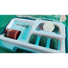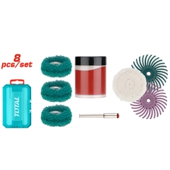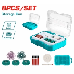 Bộ 8 đĩa mài & chà nhám gồm: 3 bánh mài, 2 bàn chải mài, 1 đĩa mài bóng, 1 vải đánh bóng, 1 trục mài. Đóng gói trong hộp nhựa
