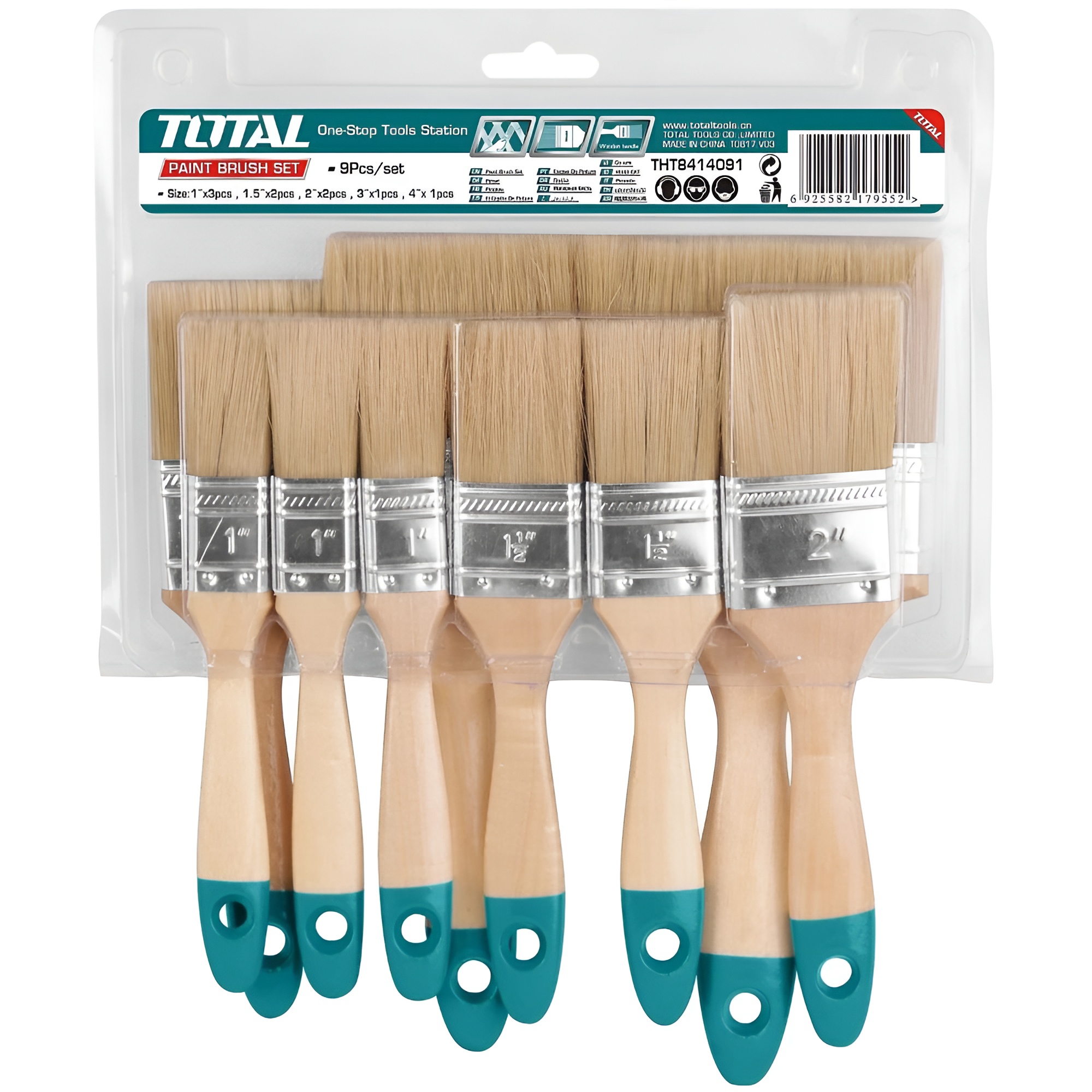 Bộ 9 cọ sơn gồm . 3 chiếc 1". 2 cái 1.5" 2 chiếc 2.0". 1 chiếc 3.0". 1 chiếc 4.0". Tay cầm bằng gỗ Đóng gói bằng vỉ đôi. 24/T