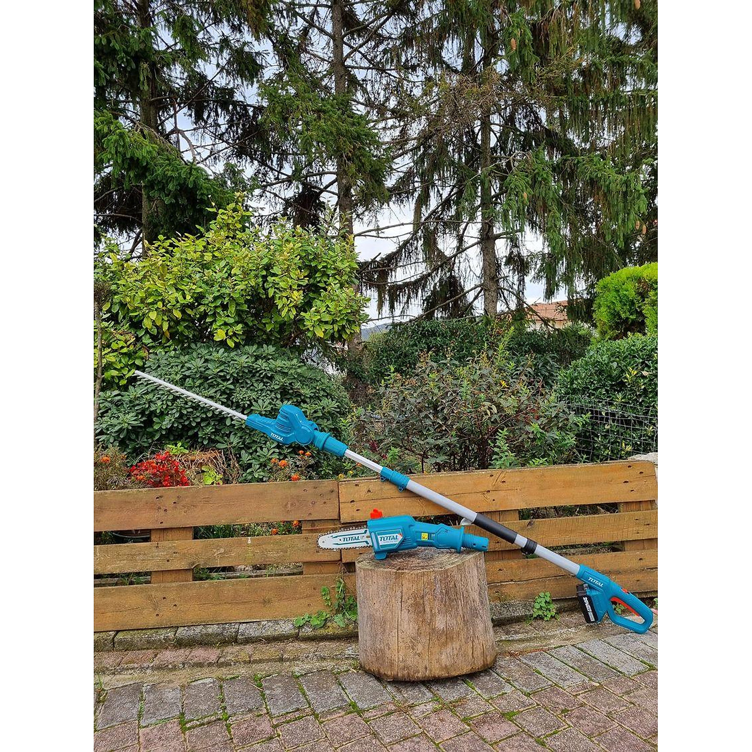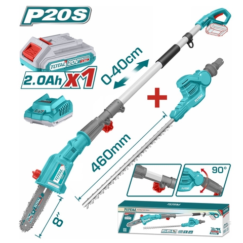 Điện thế: 20V Máy cắt hàng rào dùng pin TPHT2016012: Chiều dài lưỡi cắt: 460mm; Tốc độ tối đa: 2800spm; Đường kính cắt tối đa: 18mm; lưỡi cắt lazer Máy cưa hàng rào dùng pin TPSLI20081 Chiều dài thanh cưa: 8"(20cm), Tốc độ xích: 4,8m/s, Dung tích bình dầu: 70ml. Điện áp sạc: 220-240V~50/60Hz Kèm 1 pin 2.0Ah & 1 sạc. Đóng gói trong hộp màu