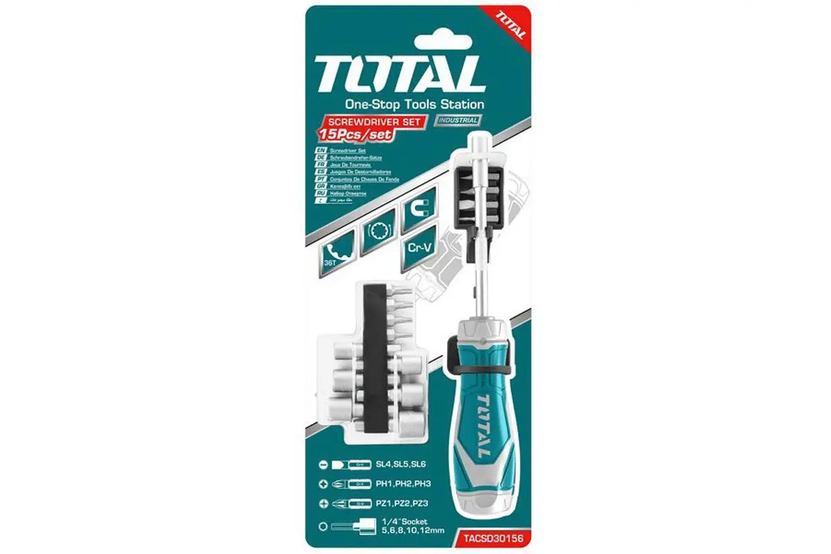 Chất liệu: CR-V - 1 cái tay cầm công nghiệp 36T, 9 cái tua vít 6.3 x 25mm với các size: SL4,SL5,SL6,PH1,PH2,PH3,PZ1,PZ2,PZ3 5 cái socket 1/4 inch : 5,6,8,10,12mm - 18/T