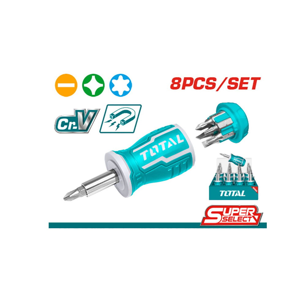 Bộ tua vít 8 trong 1. Chất liệu: Cr-V Bao gồm: 1 Tay cầm & 7 tua vít 1/4"*25mm Size: SL5,SL6,PH0,PH1,PH2,T10,T20 Đóng gói trong hộp màng co
