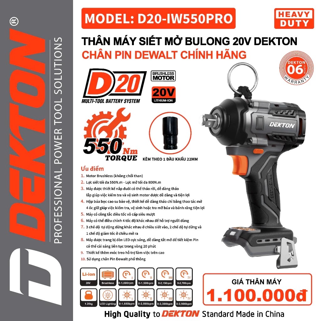 Thông số kỹ thuật : Máy siết bulong dùng pin 20V Dekton D20-IW550PRO