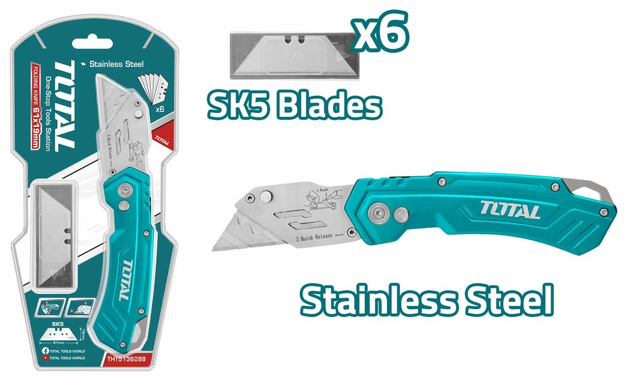 Dao gấp bằng thép không gỉ. chiều dài: 180mm Khối lượng tịnh: 65g. Kích thước lưỡi : 61mm * 19mm Kèm 6 lưỡi SK5. Chấtliệu: Thép không gỉ, Hợp kim nhôm Đóng gói bằng vỉ kép. 72/T