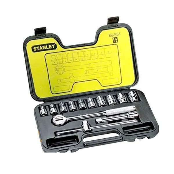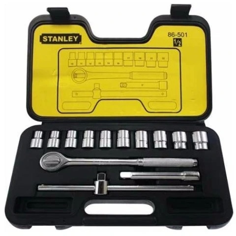 - Đầu tuýp 1/2″DR (14 chi tiết) 12PT MET Stanley 86-501 là bộ dụng cụ chính hãng của Stanley, gồm 14 chi tiết, trong đó có 10 đầu tuýp 12 góc với các kích thước từ 10 – 22mm, 1 cần siết tự động, một cần trượt và 1 cần nối dài. Sản phẩm được sử dụng phổ biến trong các ngành nghề như cơ khí, xây dựng, sửa chữa, bảo dưỡng máy móc, v.v. Công dụng của Stanley 86-501 là dùng để vặn siết hoặc mở các bu lông, đai ốc có thông số và cấu tạo tương tự như các đầu tuýp đã nêu trên.