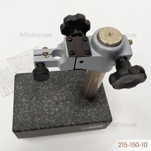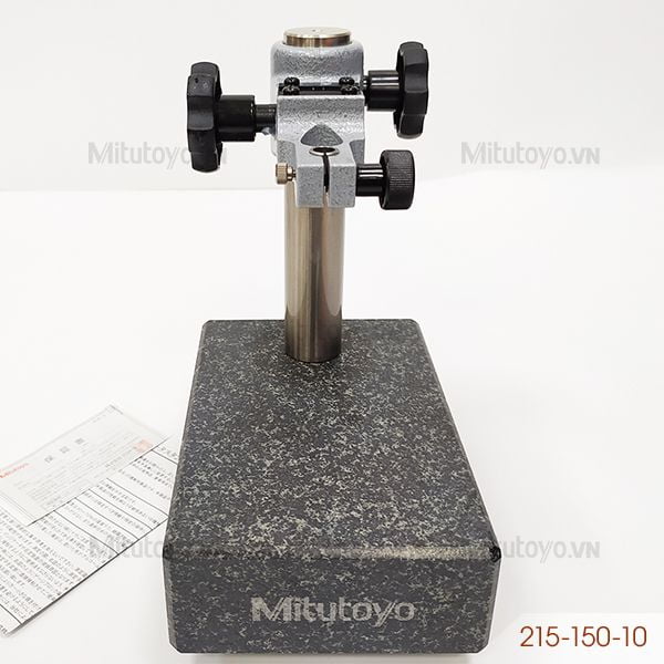 - Đế granite gá đồng hồ so Mitutoyo 215-150-10 dùng để gá đồng hồ so khi thực hiện phép đo. Phần đế có kích thước 120 x 180 x 50 mm được làm bằng đá granit mài với độ phẳng mặt đá 3μm. Phạm vi điều chỉnh lên xuống của trụ là 110mm với đường kính Ø30 mm. Sản phẩm gá đồng hồ so có đường kính trục Ø8 mm, Ø9.53 mm.