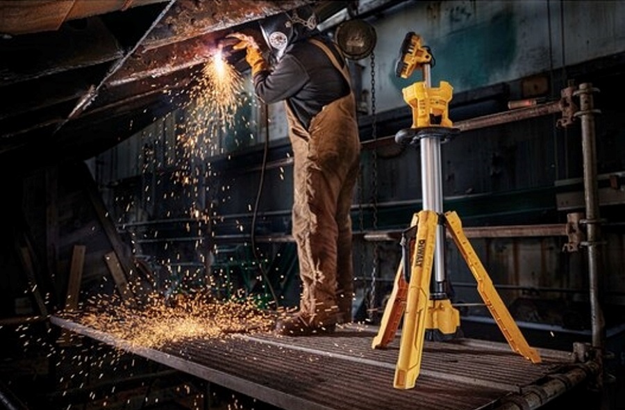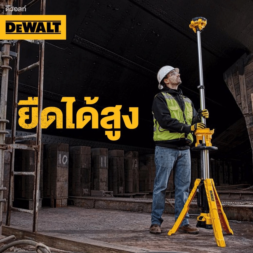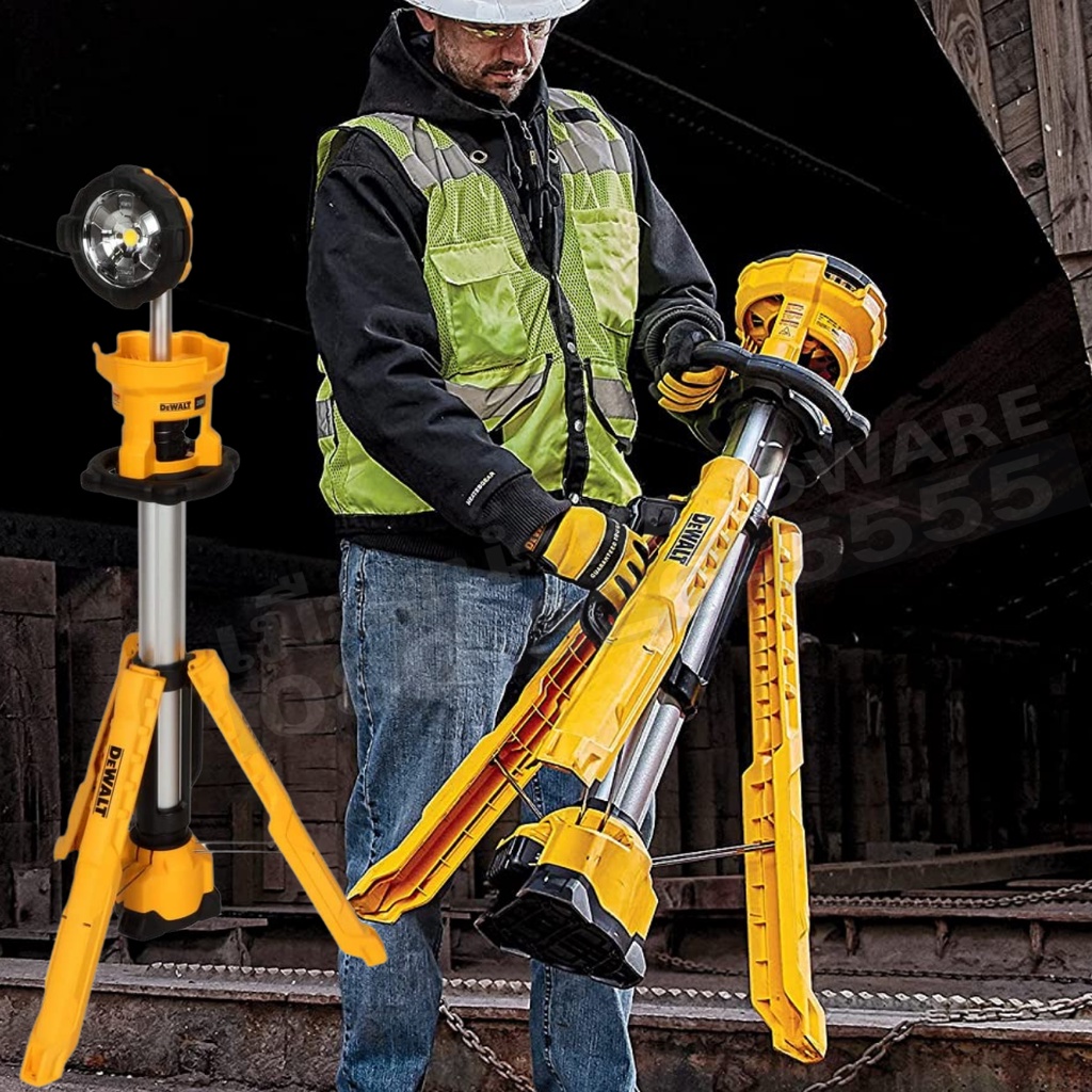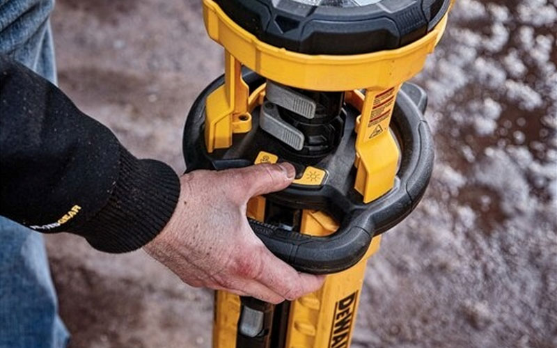 Đèn ba chân DeWalt DCL079N có thể điều chỉnh độ cao (1-2,2m) và có đầu đèn xoay và trục để điều khiển hướng phát ra ánh sáng.