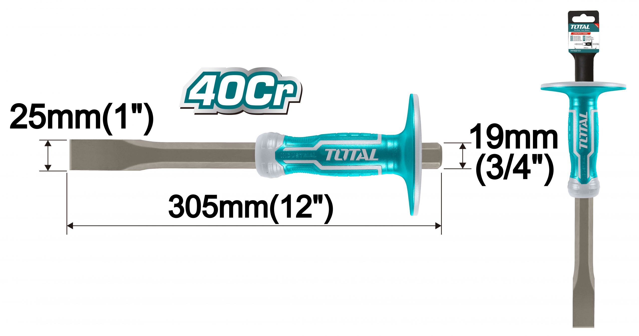 Kích thước đầu đục: 25mm. Kích thước tay cầm: 19mm Chiều dài: 305mm. Chất liệu: 40cr, chịu nhiệt nhiệt , Tay cầm TOTAL thiết kế mới Đóng gói bằng móc nhựa