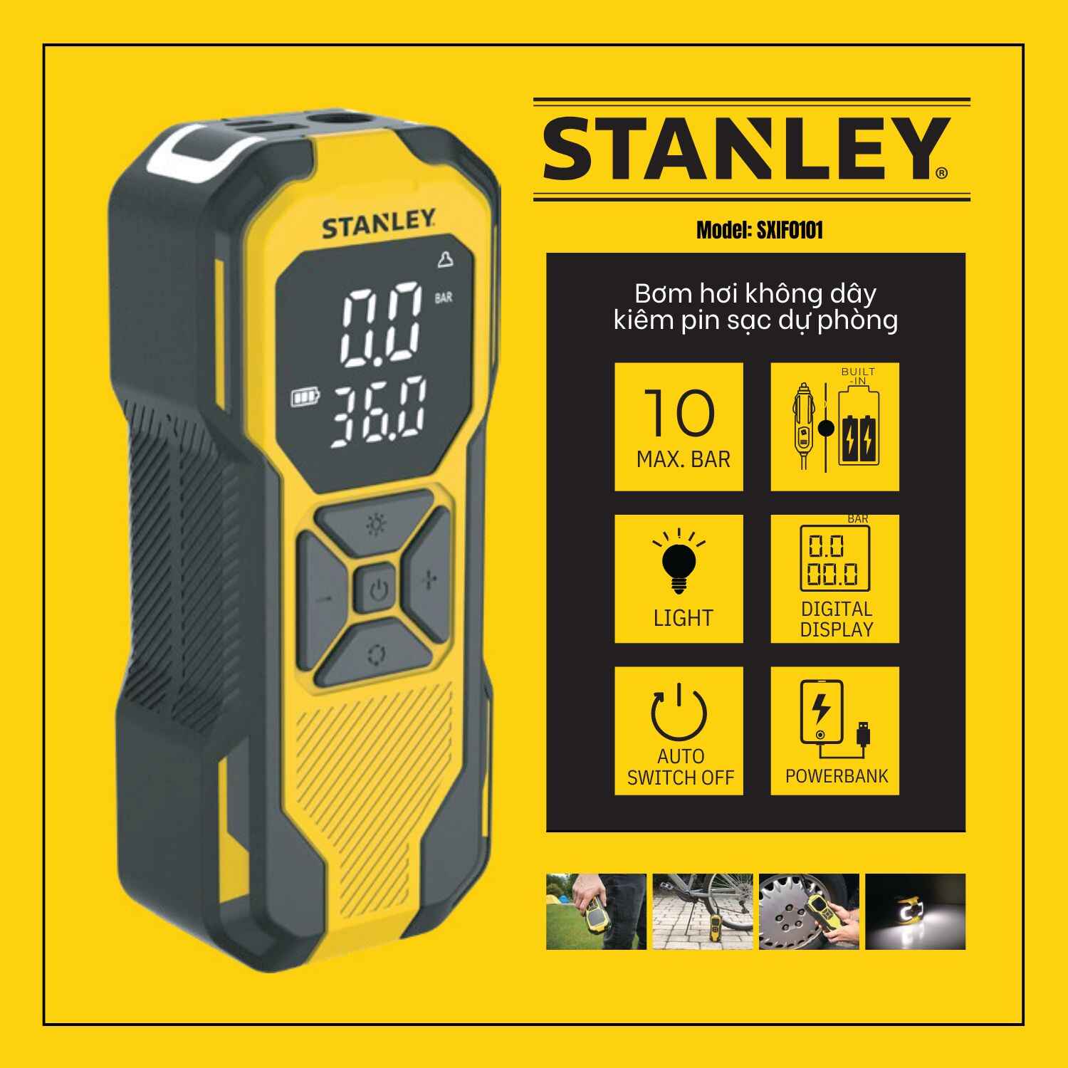 Dụng cụ đa năng bơm xe, đèn pin Led, sạc dự phòng STANLEY Model SXIF0101 Tiêu chuẩn Châu Âu