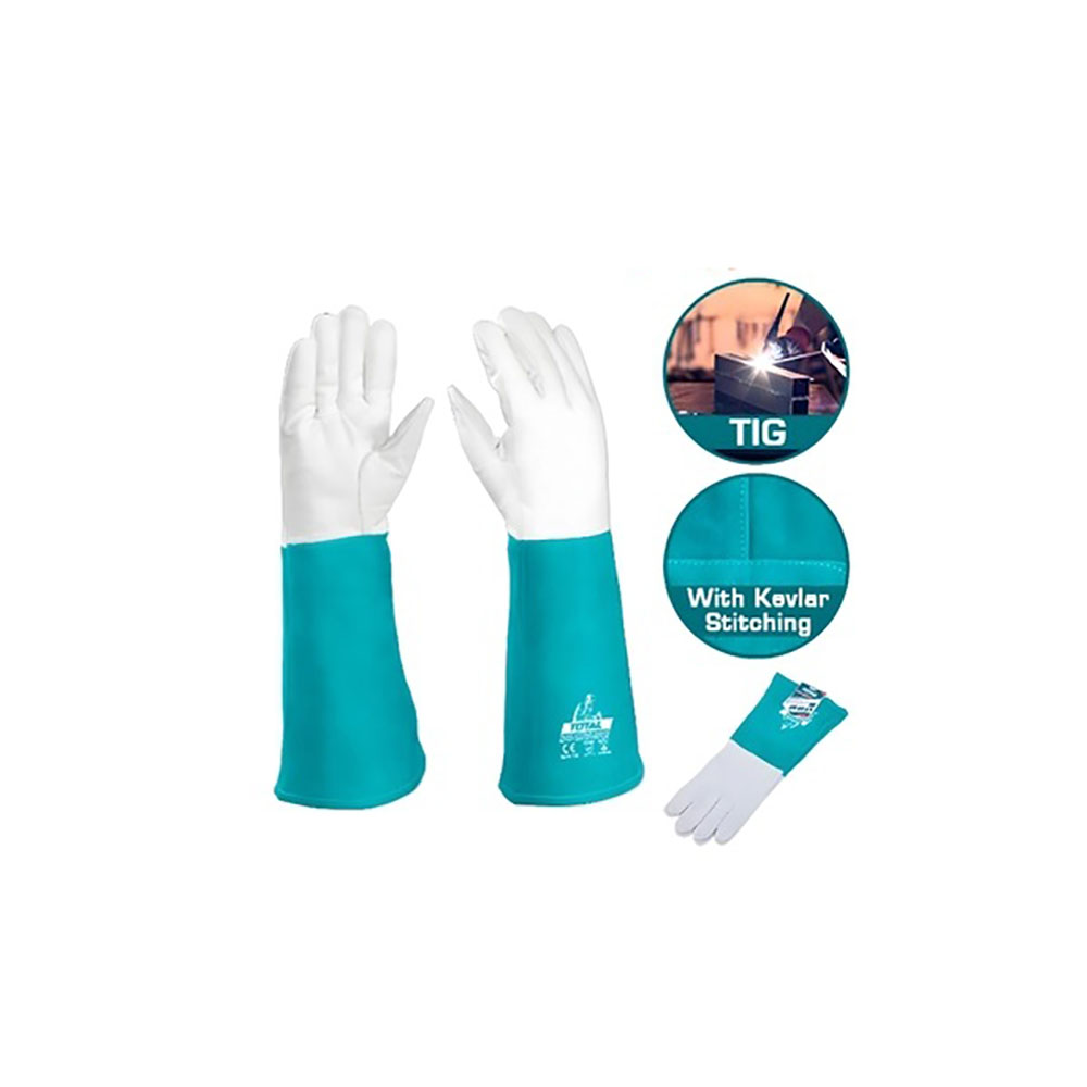 Kích thước: 16 inch Phần đầu màu trắng, ở lòng bàn tay và lưng bằng da dê, hai lớp cổ tay bằng da bò tự nhiên, Da dê mềm và chịu nhiệt;Những chiếc găng tay này phù hợp cho những công việc khó khăn đòi hỏi độ bền và cảm giác.. Đóng gói bằng túi poly
