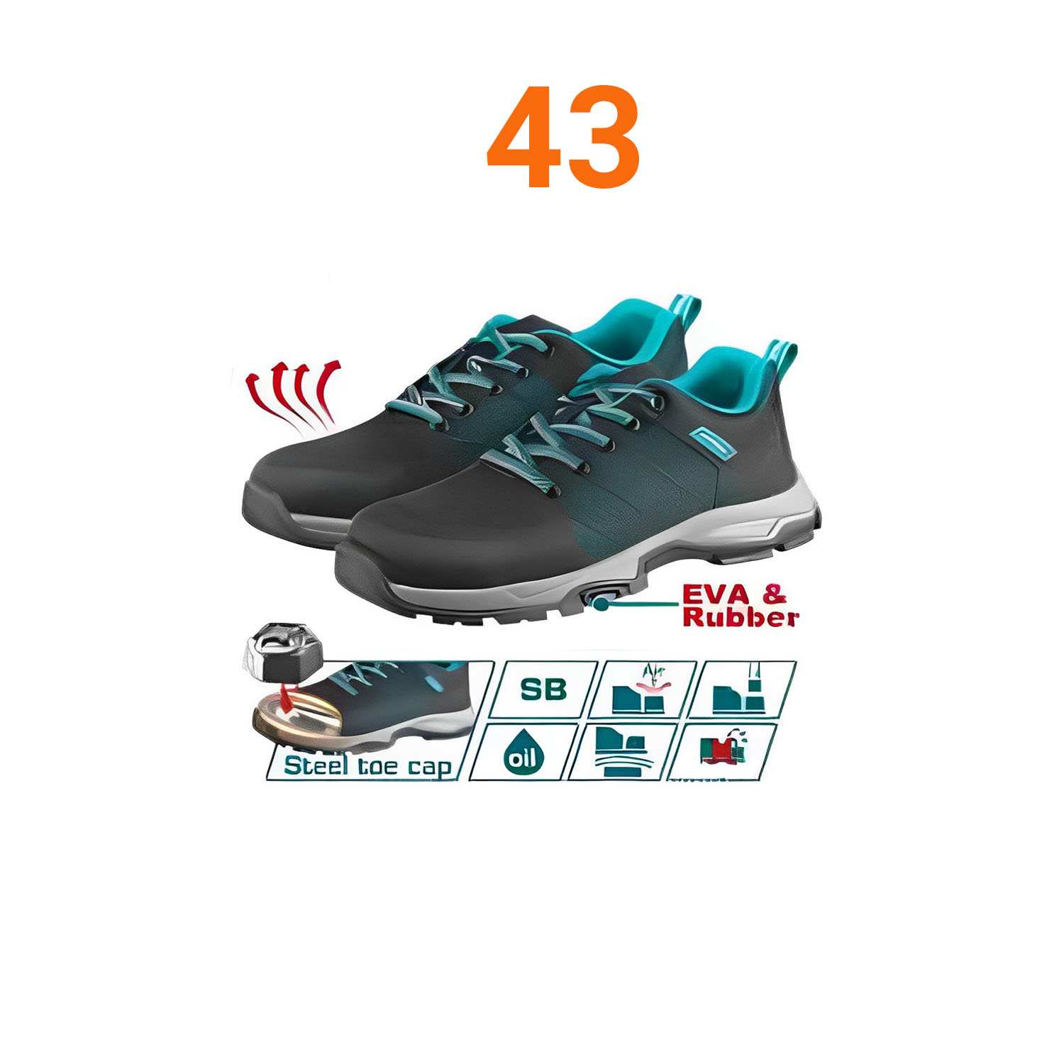 Chất liệu đế ngoài: EVA/Cao su Kích thước: 43 Mũi giày an toàn: thép Chất liệu bên ngoài: vải dệt Cấp độ an toàn: SB Thân trên giày có độ thoáng khí tốt Đế EVA & cao su, có thể ngăn chặn quá trình ứ nước. Đóng gói trong hộp màu