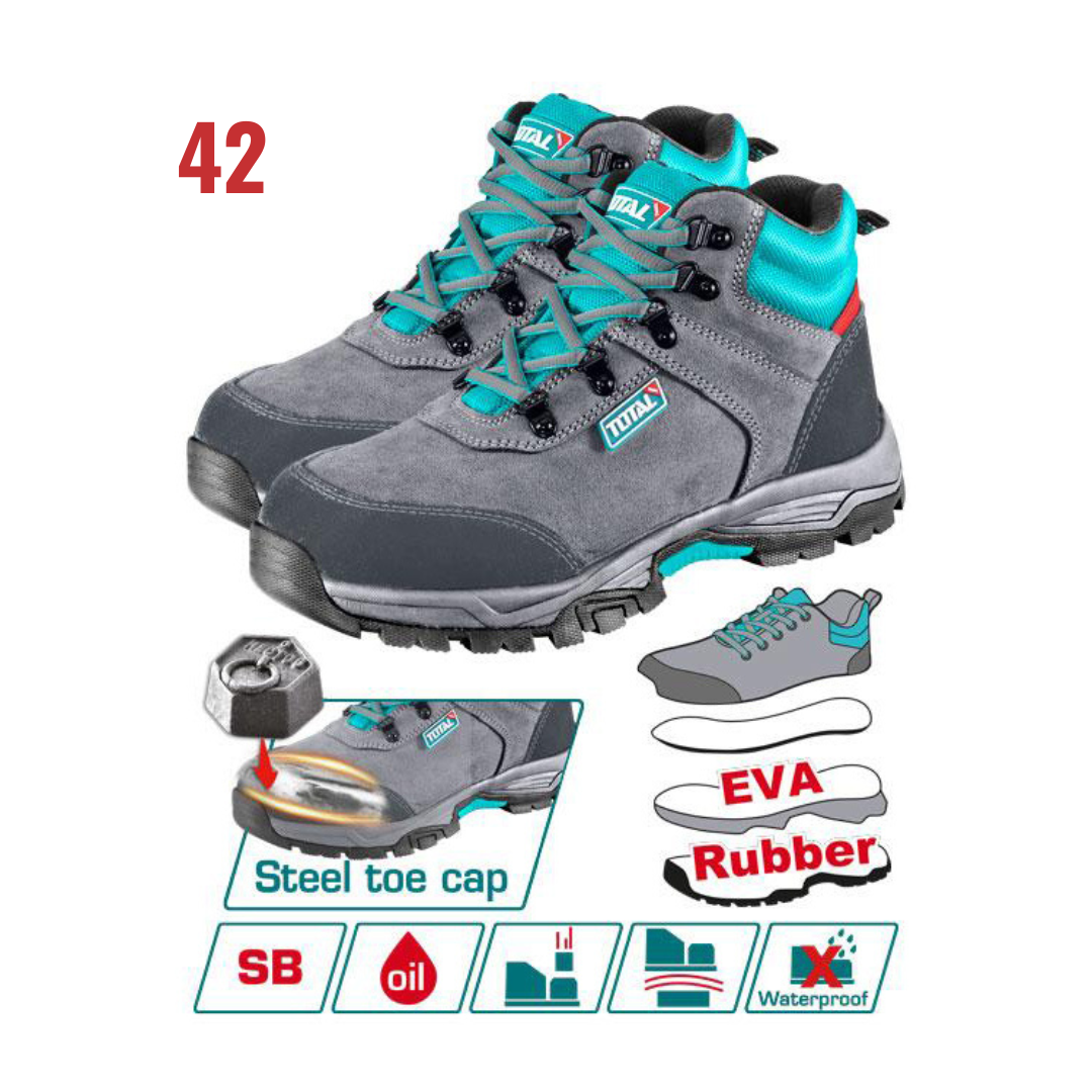 Chất liệu đế ngoài: EVA/Cao su Kích thước: 42 Mũi giày an toàn :bằng thép Chất liệu bên ngoài: da Cấp độ an toàn: SB Đế EVA & cao su, có thể ngăn chặn quá trình thủy phân Đóng gói bằng hộp màu