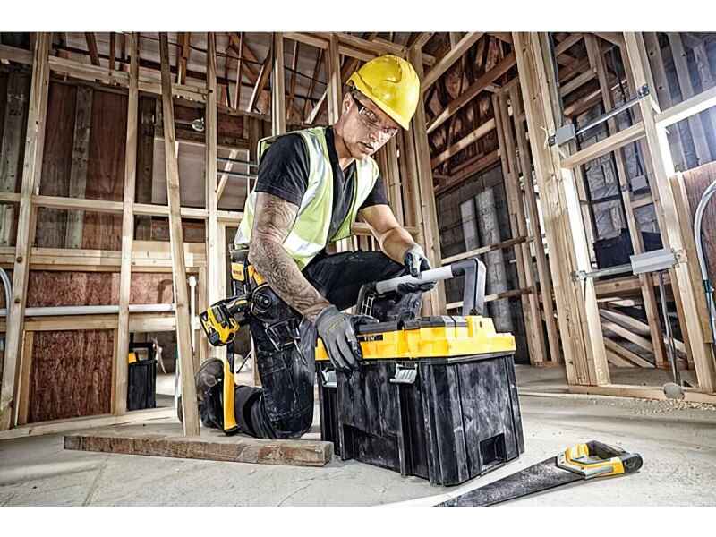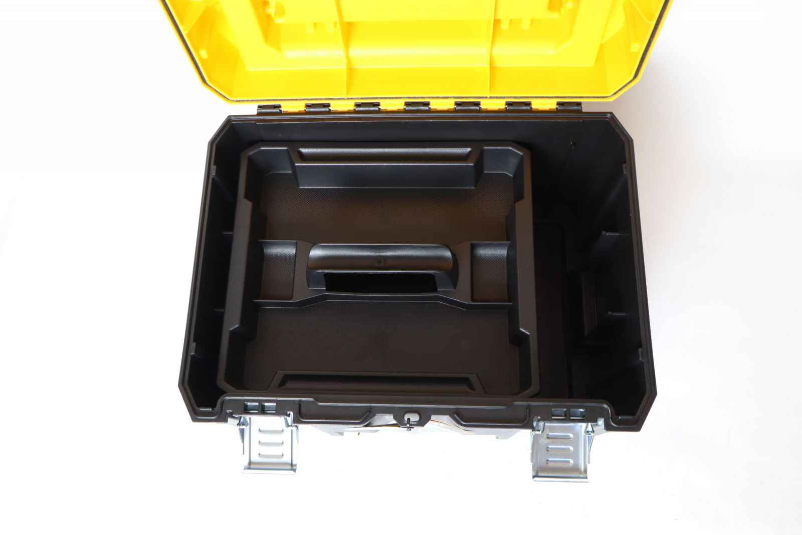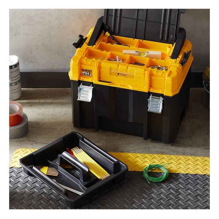 - Phần nắp bên trên được thiết kế kết hợp với 7 ngăn chứa vít giúp chứa đựng rất nhiều ốc vít và dụng cụ. DWST83343-1 được trang bị kẹp khóa bằng kim loại chắn chắn.