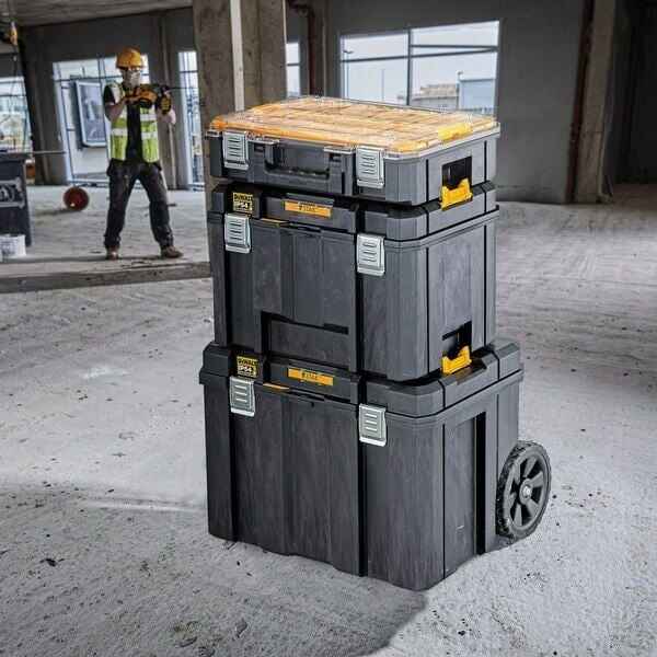 - Thùng đựng dụng cụ Dewalt DWST83347-1 nặng 9,9 kg, được tích hợp 2 bánh xe và cần kéo thuận tiện khi di chuyển ngoài công trường. Người dùng có thể thay đổi chiều cao của cần kéo một cách linh hoạt.