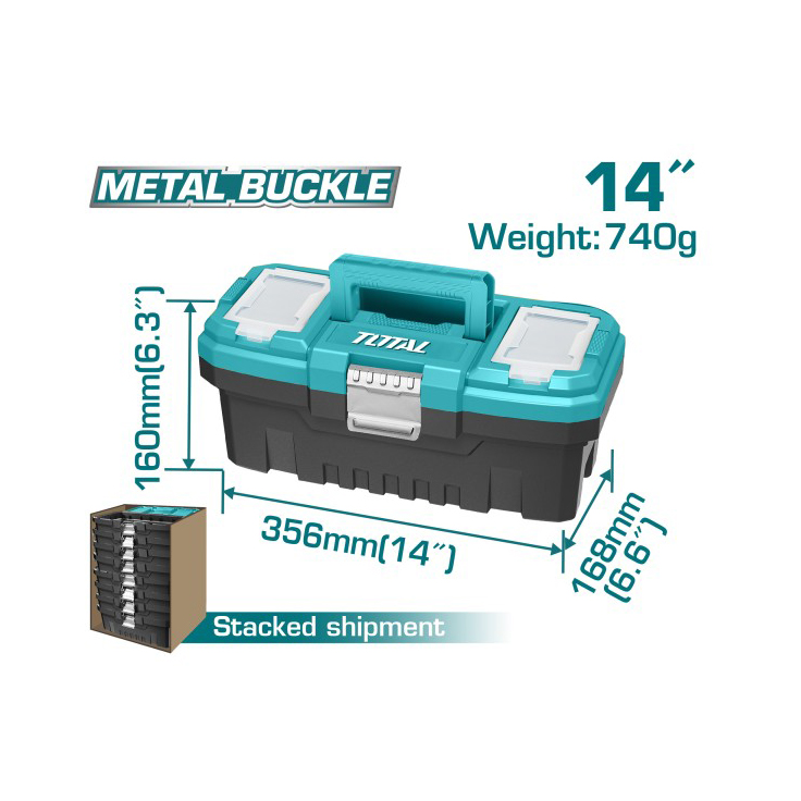 Kích thước: 356mm (14") *168mm (6,6") *160mm(6,3") Chất liệu: nhựa PP, trọng lượng: 740g Tải tối đa: 10KG, Khóa kim loại Tay cầm độ bền cao, Nắp trên có ba khu vực lưu trữ Nắp trên có chia mức tỷ lệ, Chứa 1 cái khay nhựa