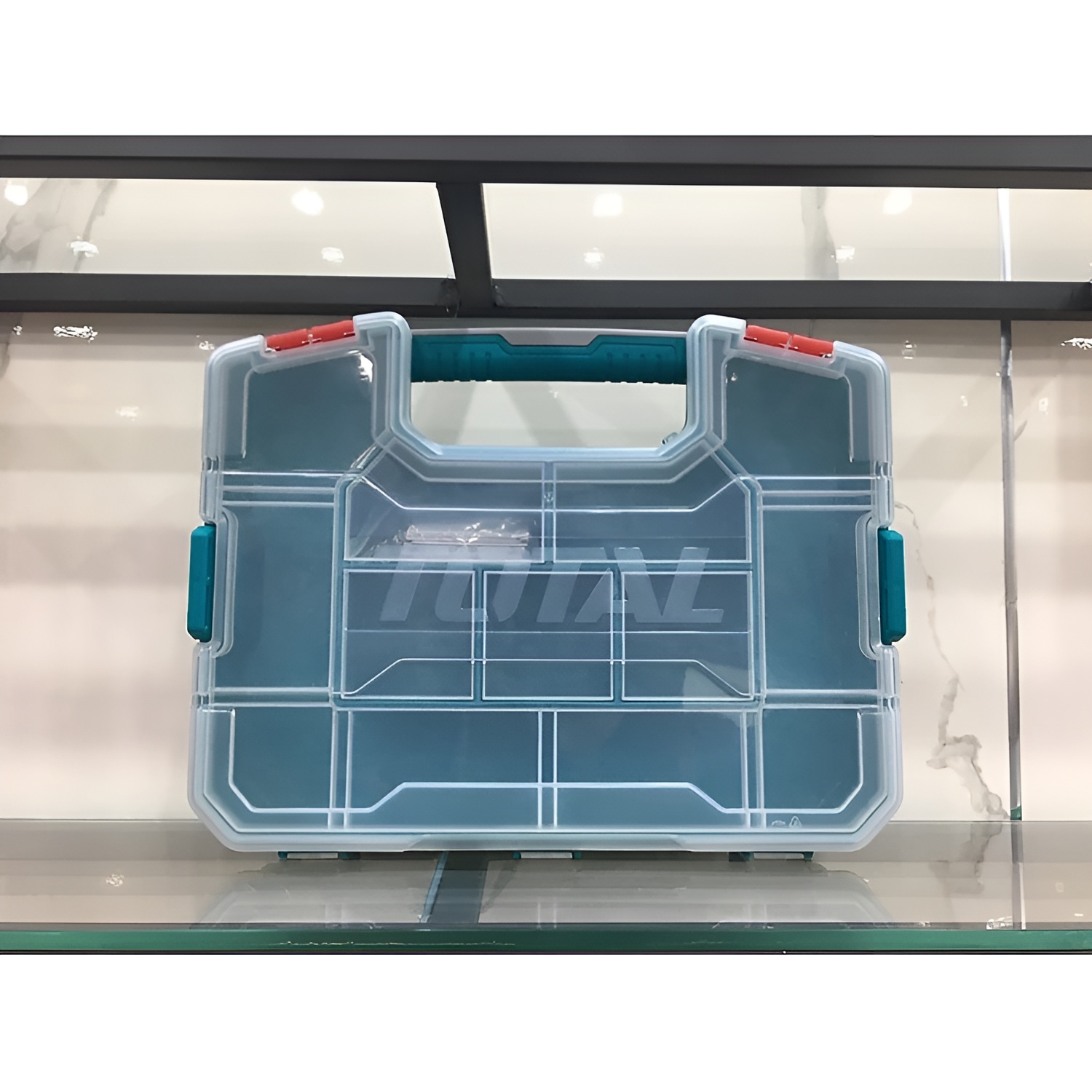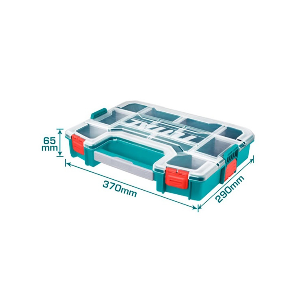 Kích thước: 370mm(14.5”)*290mm(11.4”)*65mm(2.5”. Có thể xếp chồng lên nhau. Chất liệu: NHỰA PP vách ngăn có thể tháo rời, đóng gói bằng hộp carton