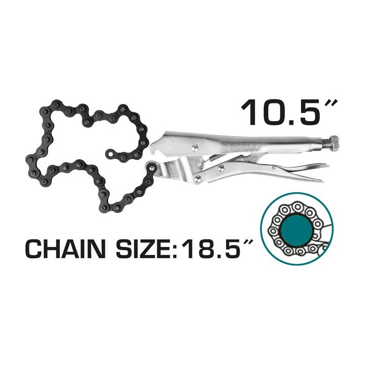 Thép carbon, Size: 10,5 inch Kích thước dây xích :18,5 "/ 470mm. Mạ niken Trọng lượng: 700g. Chức năng tương tự như THT1941001 Đóng gói bằng hộp màu. 20/T