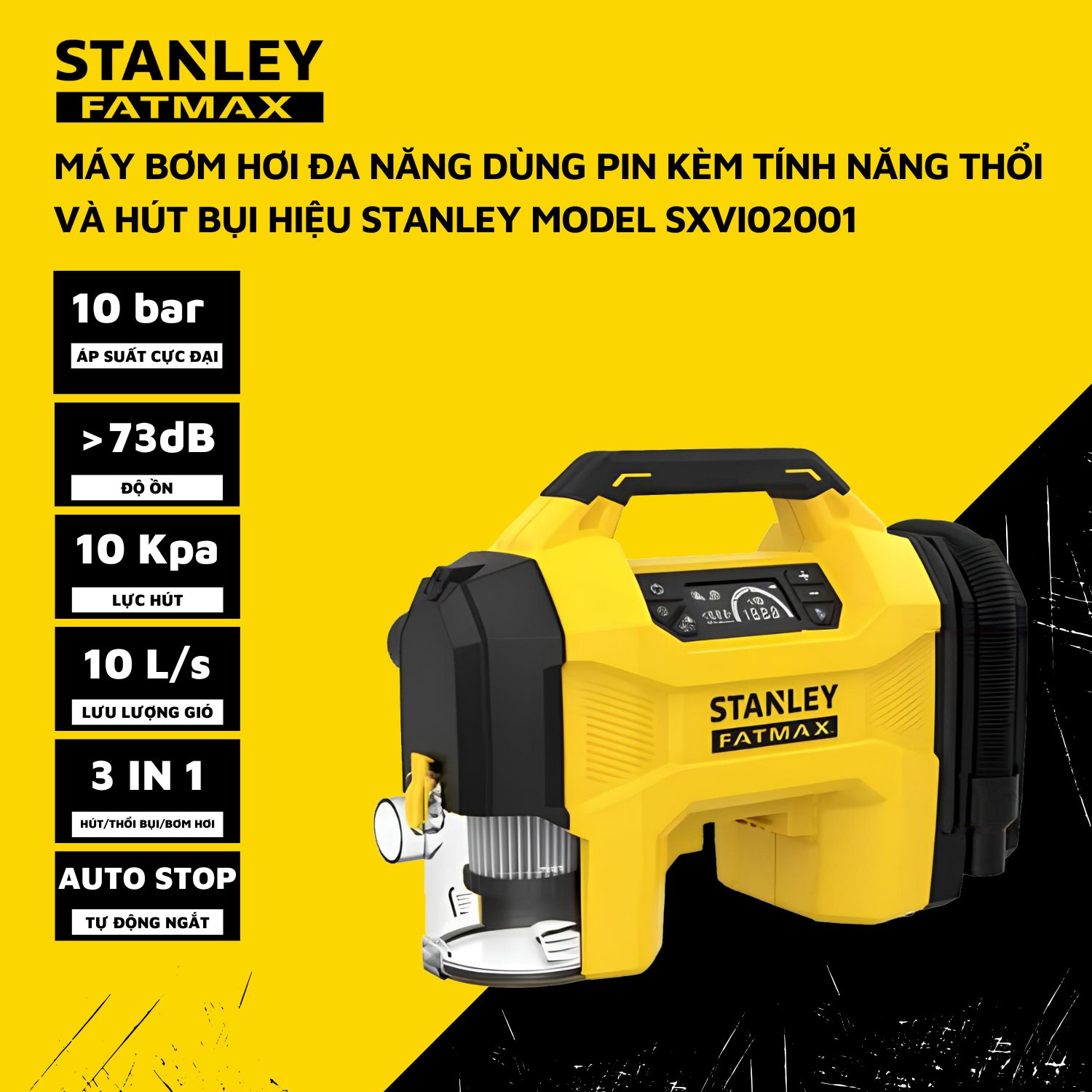 - Máy bơm hơi đa năng dùng pin kèm chức năng thổi và hút bụi hút nước STANLEY - SXV102001 là thiết bị 3 trong 1 lý tưởng cho ô tô, kết hợp bơm hơi, hút bụi và thổi bụi.