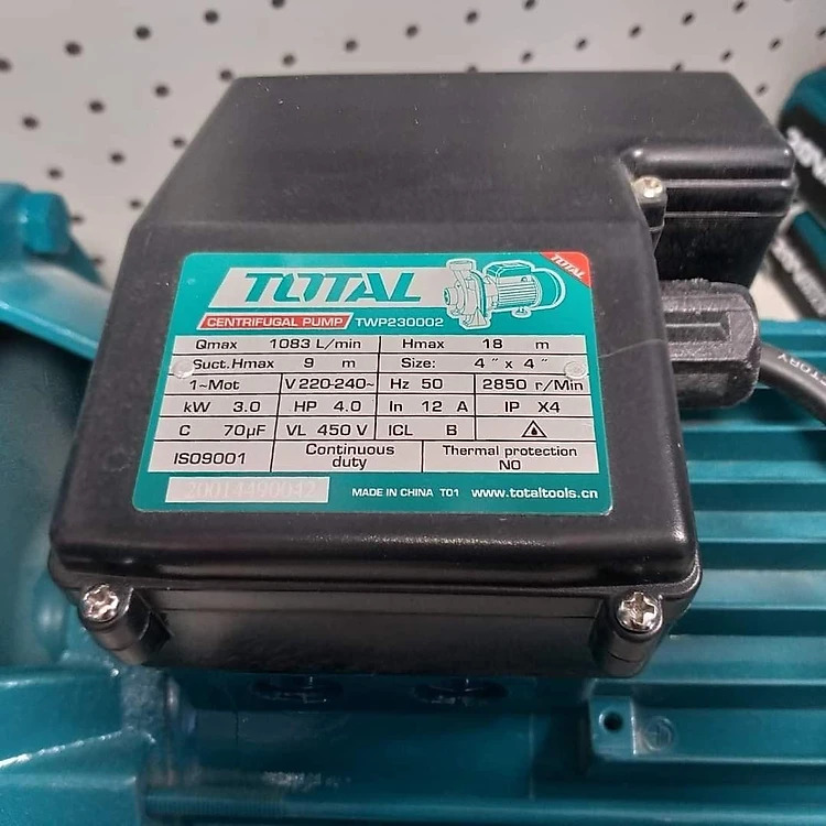 Máy bơm ly tâm. Điện áp:220-240V~50Hz Công suất định mức: 3000W(4HP). Đầu bơm tối đa: 18m Lưu lượng tối đa: 1083L/phút Độ hút sâu tối đa: 9m; Đường kính ống: 4"x4" Động cơ dây đồng; cánh quạt bằng thép không gỉ Dây điện 0.3m. Đóng gói trong thùng gỗ ép