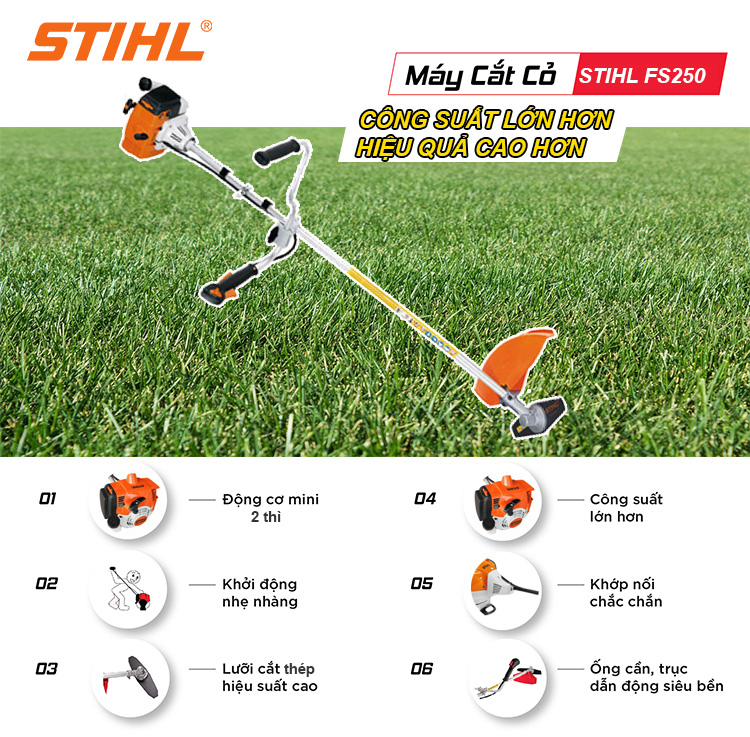 Máy cắt cỏ đeo vai Stihl FS 250 sử dụng động cơ dùng để cắt tỉa cỏ ở vườn. Máy cắt cỏ đeo vai Stihl FS 250, dòng máy cắt cỏ có công suất lớn, vòng tua nhanh, cắt khỏe. Máy cắt cỏ đeo vai thích hợp cho việc phát cỏ rẫy, phát cỏ vườn tiêu, vườn cà phê, vườn điều và mở đường trong rừng. Cần trục chống xoắn, then hoa bền giúp máy có thể làm việc với tải trọng nặng hơn.