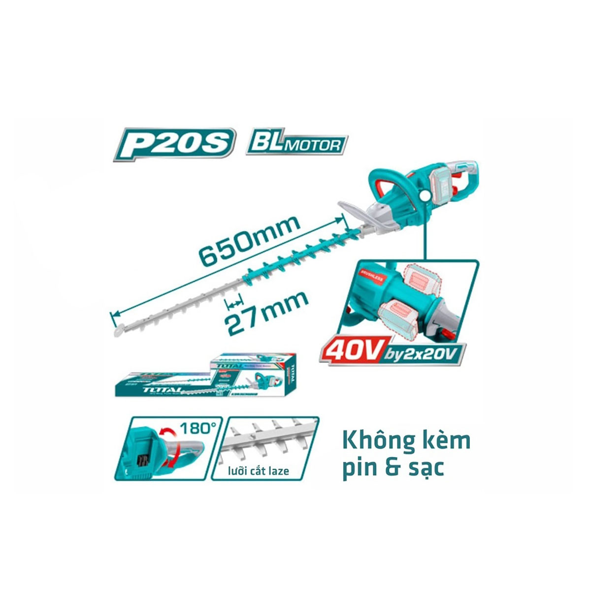 Mô tơ không chổi than. Điện áp: 40V (20V+20V) Tốc độ không tải: 3600spm. Chiều dài lưỡi cắt: 650mm Khoảng cách răng cưa: 27mm. Lưỡi cắt laser để cắt sạch Pin và bộ sạc được bán riêng. Đóng gói bằng hộp màu